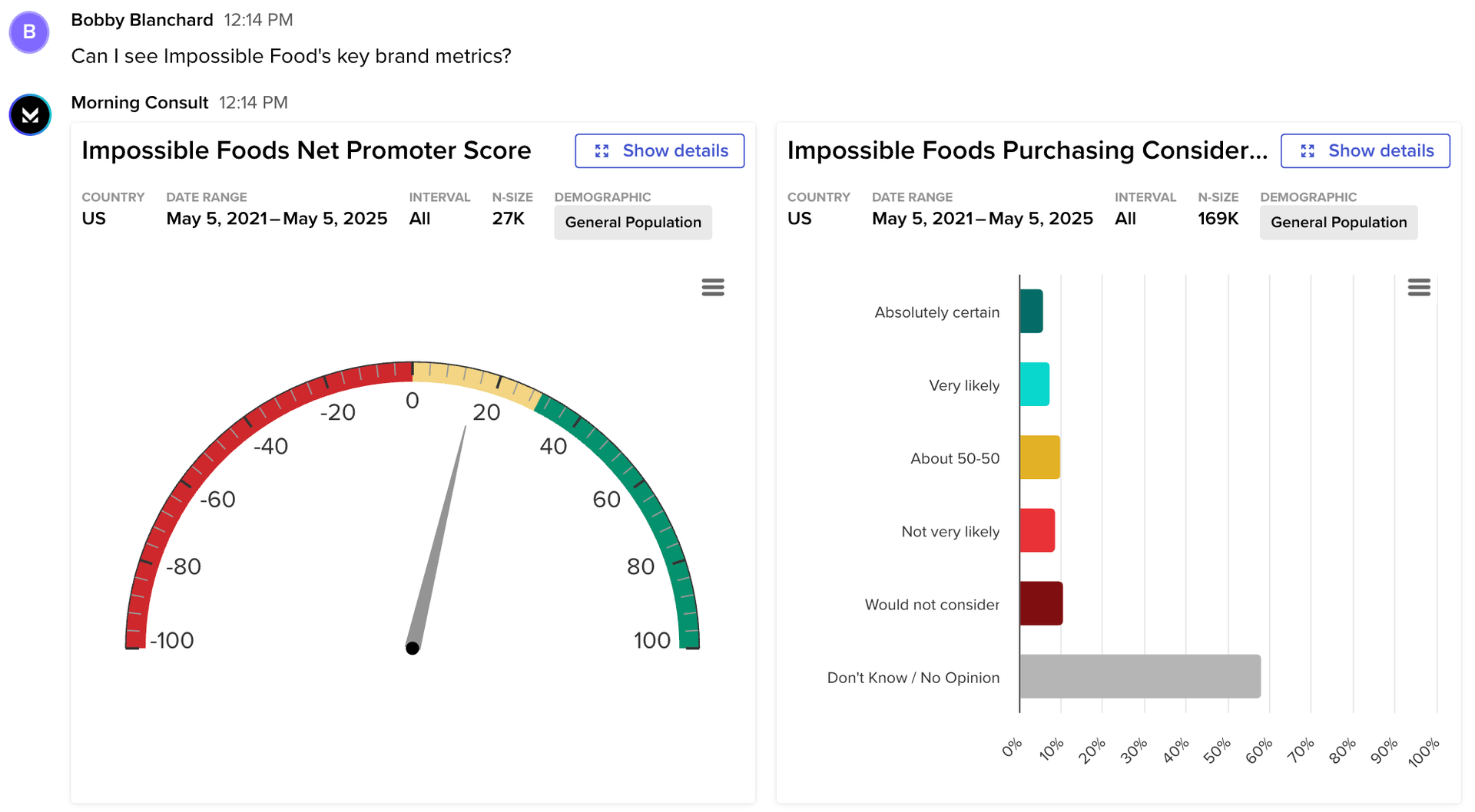 Today we want to go deep on one brand to explore the meat alternative market. Let’s start by asking MorningConsult.AI for the key brand metrics of Impossible Foods, one of the leading brands that sells plant-substitute food.