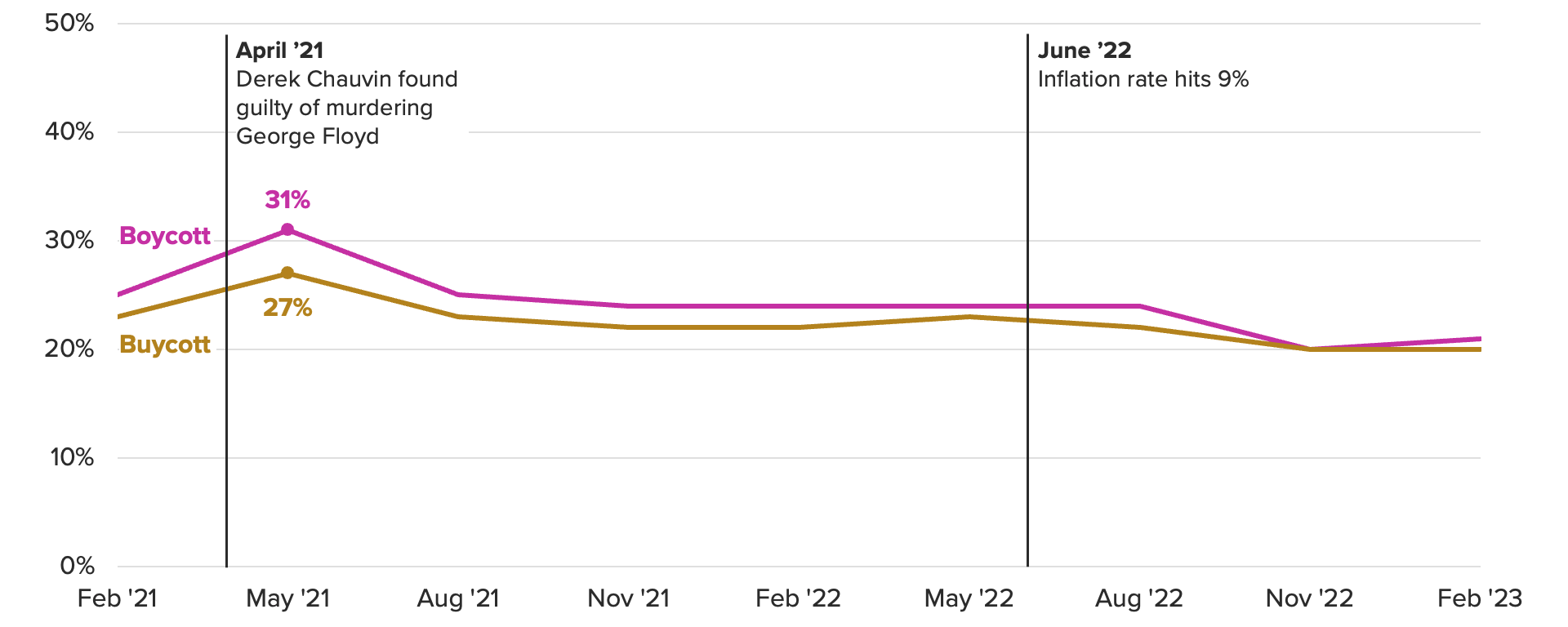 Since early 2021, Morning Consult has tracked consumers’ decisions to boycott a company based on its political statements, as well as to “buycott” — meaning to shop from a company specifically because of a political stance it has taken. These shopping behaviors peaked in May 2021, when 31% of U.S. consumers said they had boycotted a company and 27% had buycotted. That survey was conducted a month after former police officer Derek Chauvin was found guilty of murdering George Floyd, resurfacing headlines that sparked a summer of nationwide protests and brand statements a year prior. 2022 was a year of decline in consumers making shopping decisions based on brands’ political actions, and as of early 2023, the boycott and buycott numbers sit at 21% and 20%, respectively.
