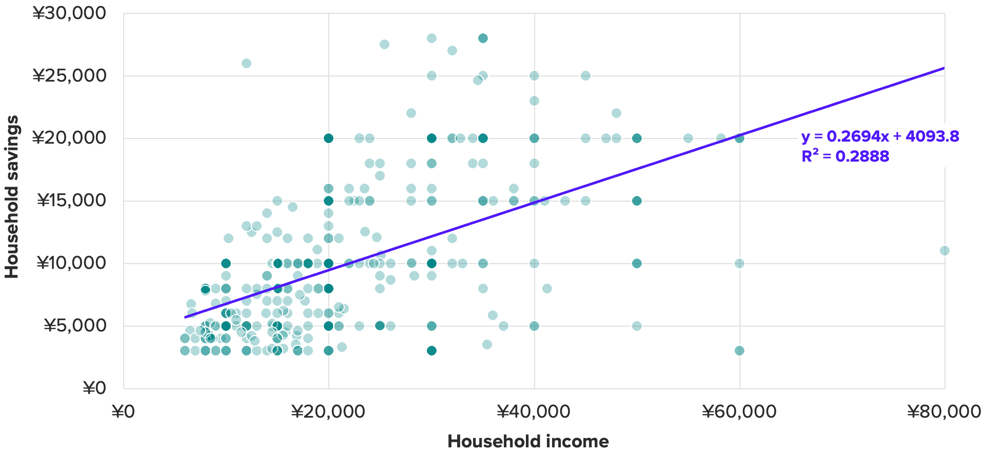 This rate is not exactly equivalent to the marginal propensity to save since it excludes households with no or negative monthly savings in July. However, it does confirm that higher incomes generally correlate with higher savings among those who saved money in July.