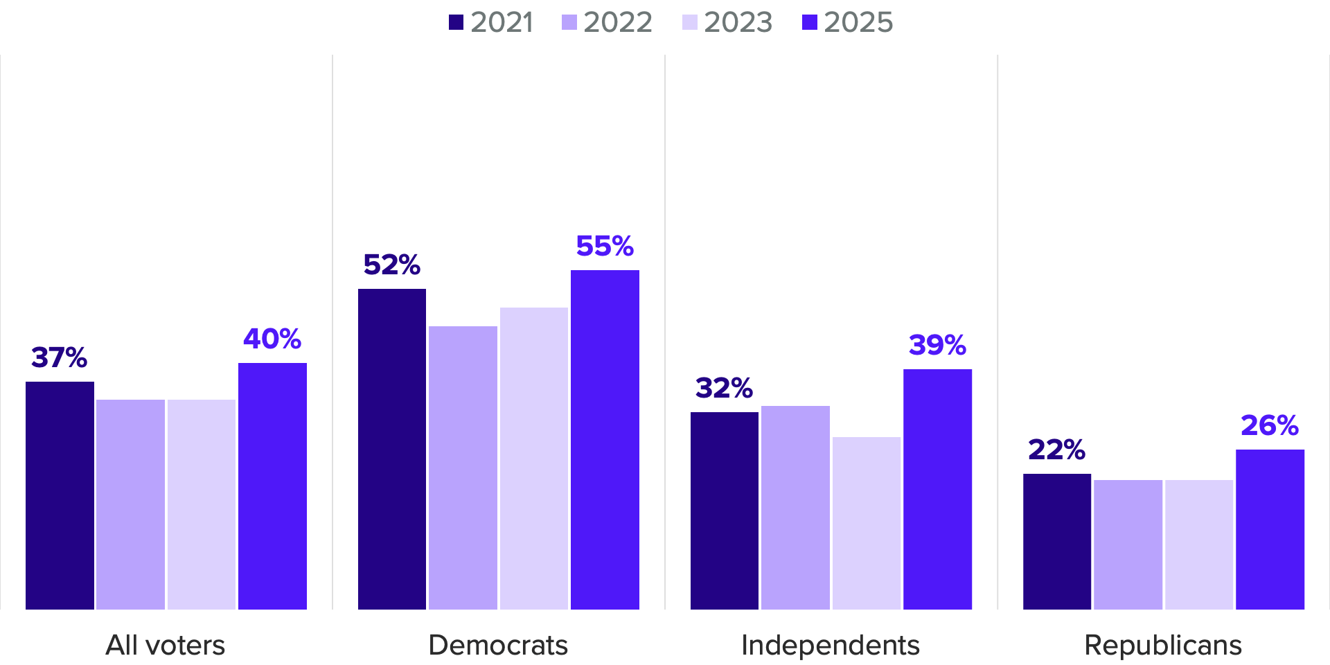 Two in 5 voters are “very concerned” about how natural disasters will affect their communities, up from 37% in 2021. The shift was largest among independent voters, who — like the larger electorate, including both Democrats and Republicans — are more concerned about these weather events than their underlying cause, climate change.