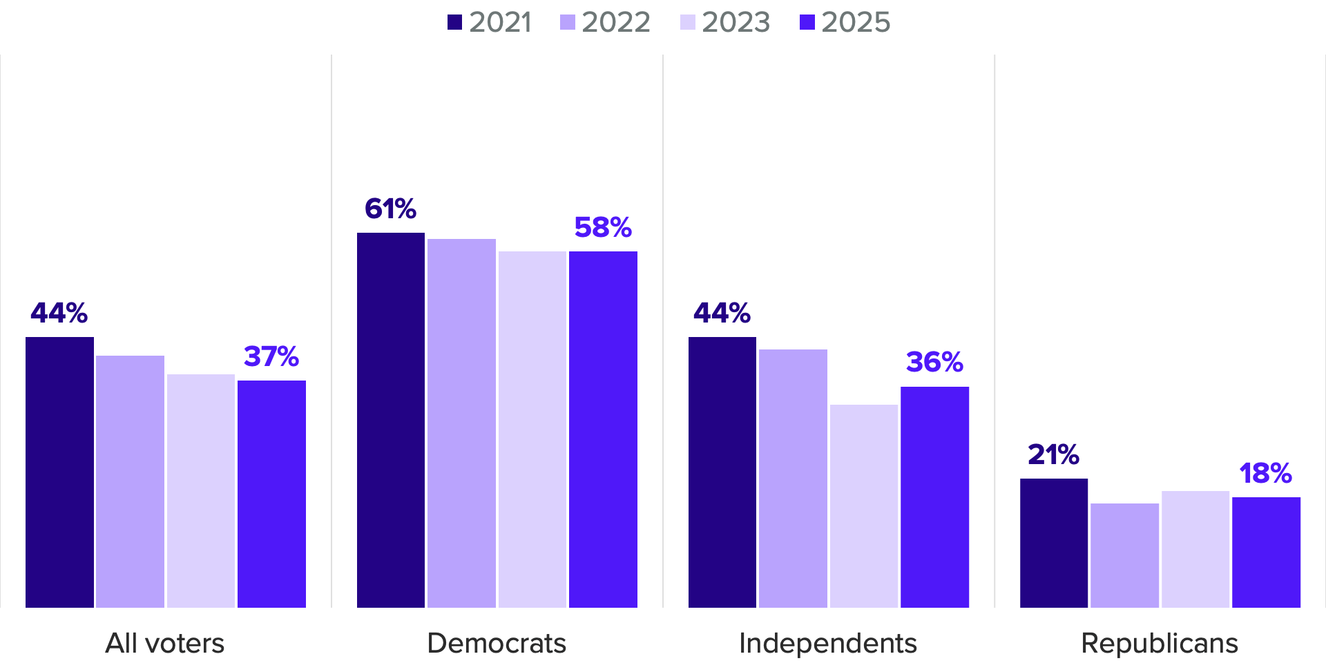 According to our July 18-20 survey, 37% of voters are “very concerned” with the issue of climate change and its impacts, down from 44% in 2021 at the beginning of the Biden administration. In total, 67% of voters are at least “somewhat concerned” about the matter, a figure that has also declined, from 76%, since 2021.