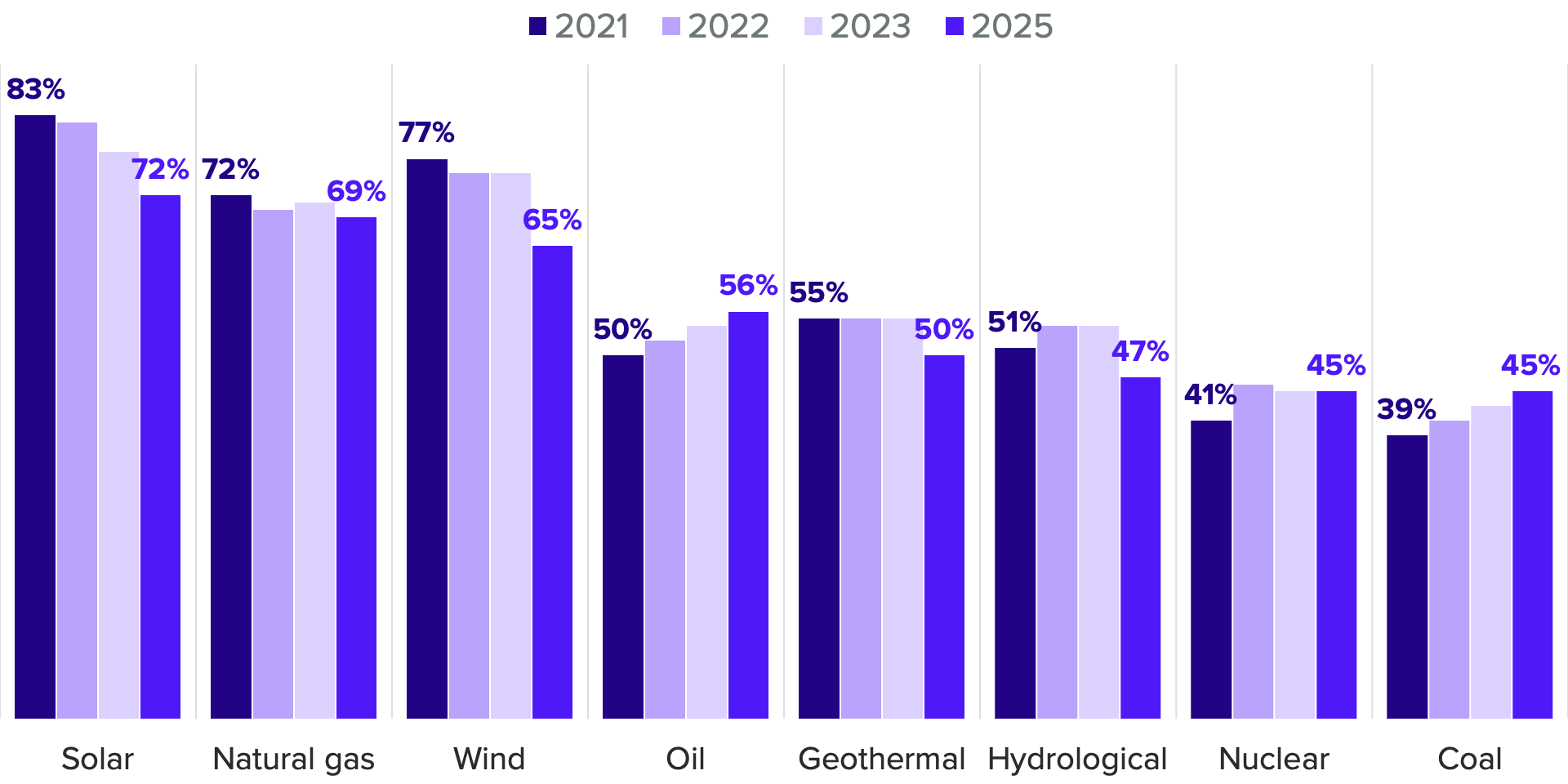 The majority of Americans hold favorable views about power from solar, the most popular energy source, and wind, but those ratings have each dropped by more than 10 points since 2021 as the shares with favorable views of oil (56%) and coal (45%) have each ticked up by 6 points.