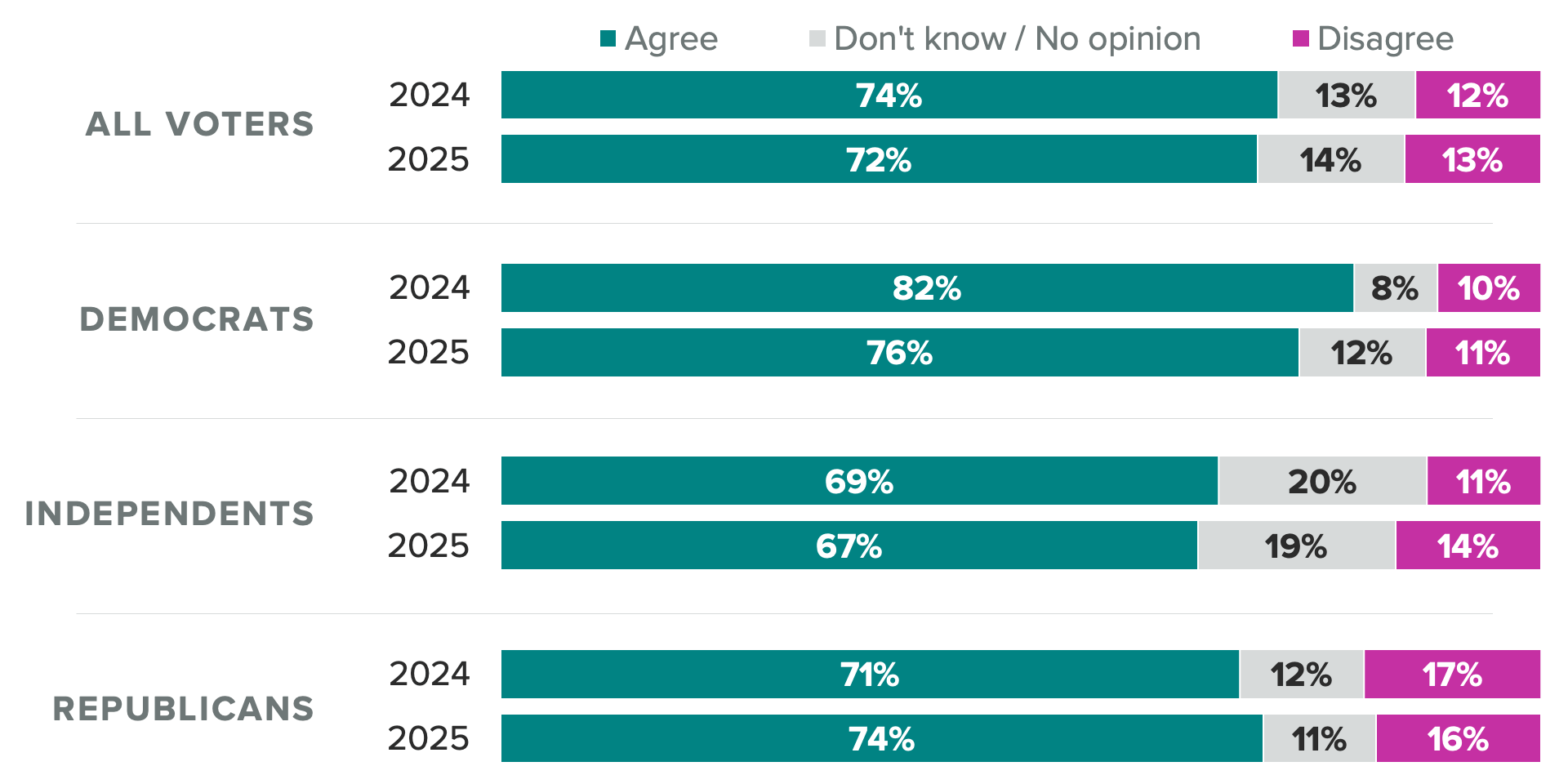 Our 2025 corporate political engagement survey showed that 72% of Americans, including most Republicans and Democrats, believe businesses have a responsibility to protect and take care of the environment through efforts to reduce environmental waste or their carbon footprint, down only slightly since the previous year. Similarly, most Americans (62%) think it is important for businesses to speak out on the environment and climate change, almost exactly the share who said the same in 2024.