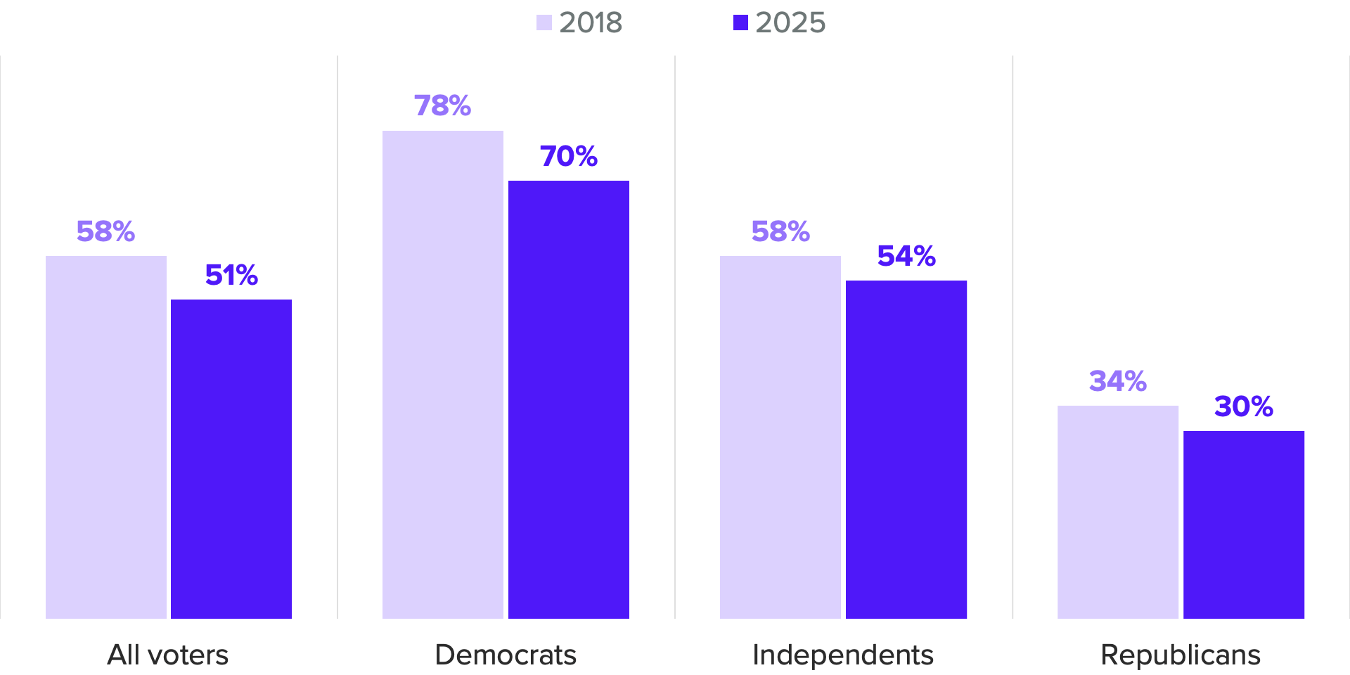 While there have been modest declines in the shares of Democrats and Republicans who express high levels of concern about climate change, it remains a big fear for voters on the left, who are three times as likely to be very concerned than those in Trump’s party. Notably, the bulk of the decline came among voters affiliated with neither party, whose numbers largely align with the overall electorate.
