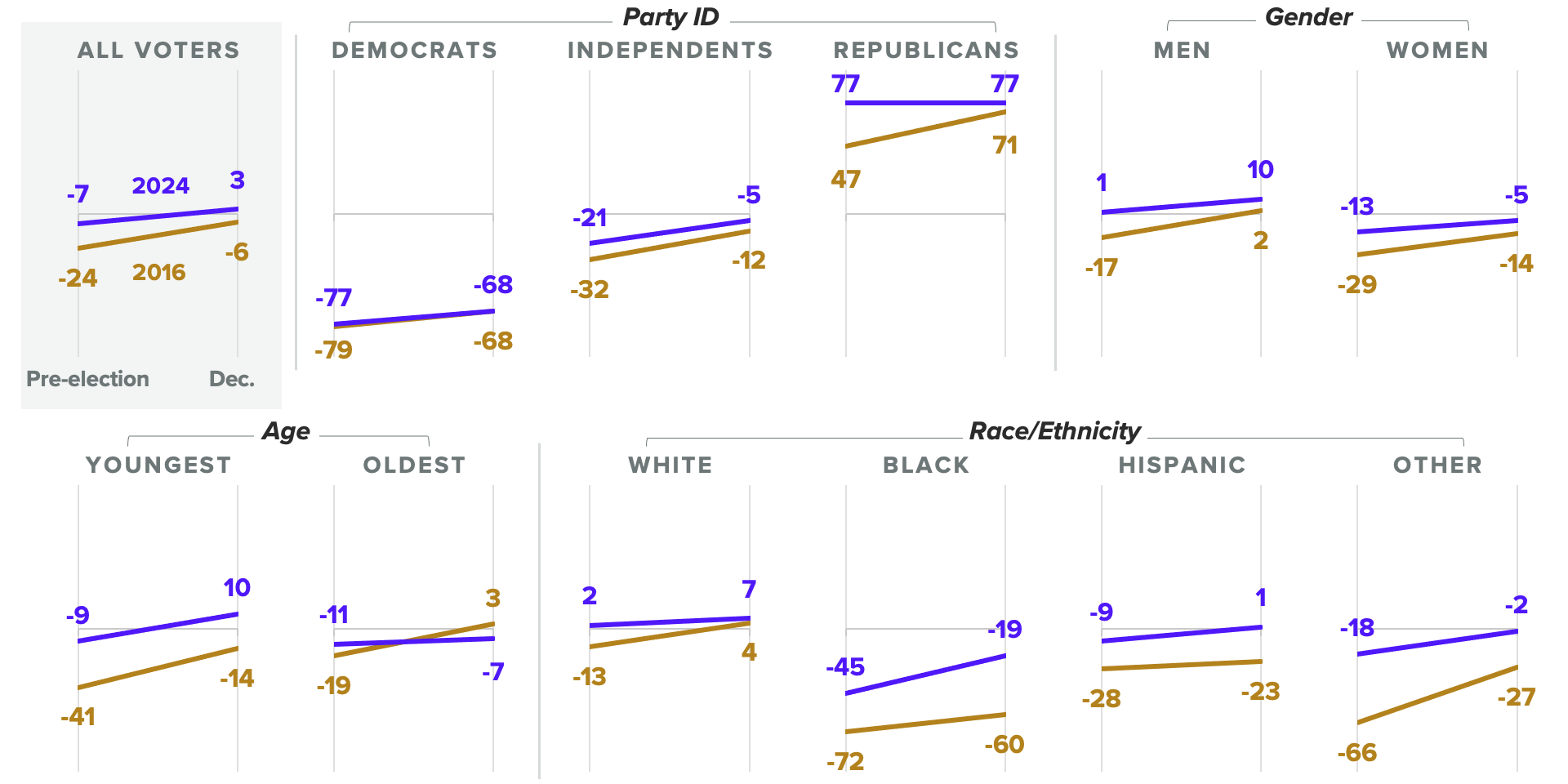 Surveys conducted Nov. 4-5 and Dec. 8-11, 2016, and Nov. 1-3 and Dec. 6-8, 2024, among roughly 2,000 registered voters each, with margins of error of +/-2 percentage points.