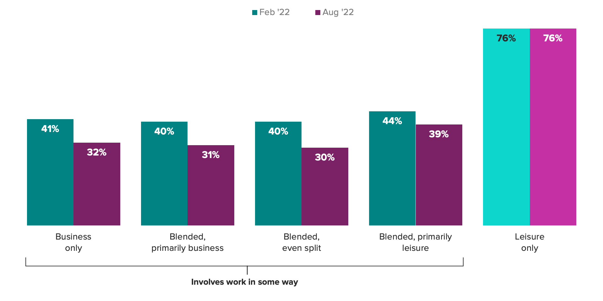 The share of adults saying they’d take a trip that involves work in some way dropped several percentage points across all occasions between February and August, while the share saying they’d travel just for leisure stayed the same.