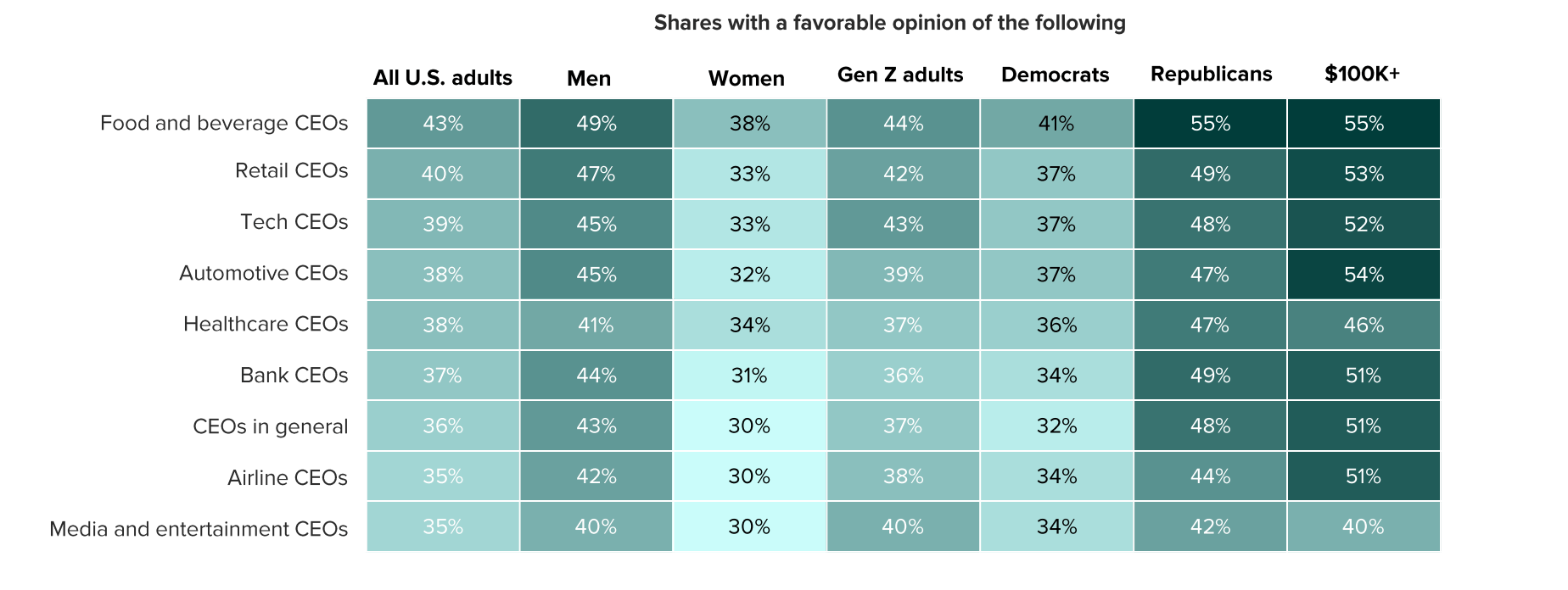 That said, opinions vary starkly across demographics, similar to other industries. Men, Republicans and higher earners are particularly sympathetic towards CEOs, while the opposite is true of women, Democrats and low earners. Download our full report to see what Americans really think of CEOs, including a ranking of consumers’ favorite executives.