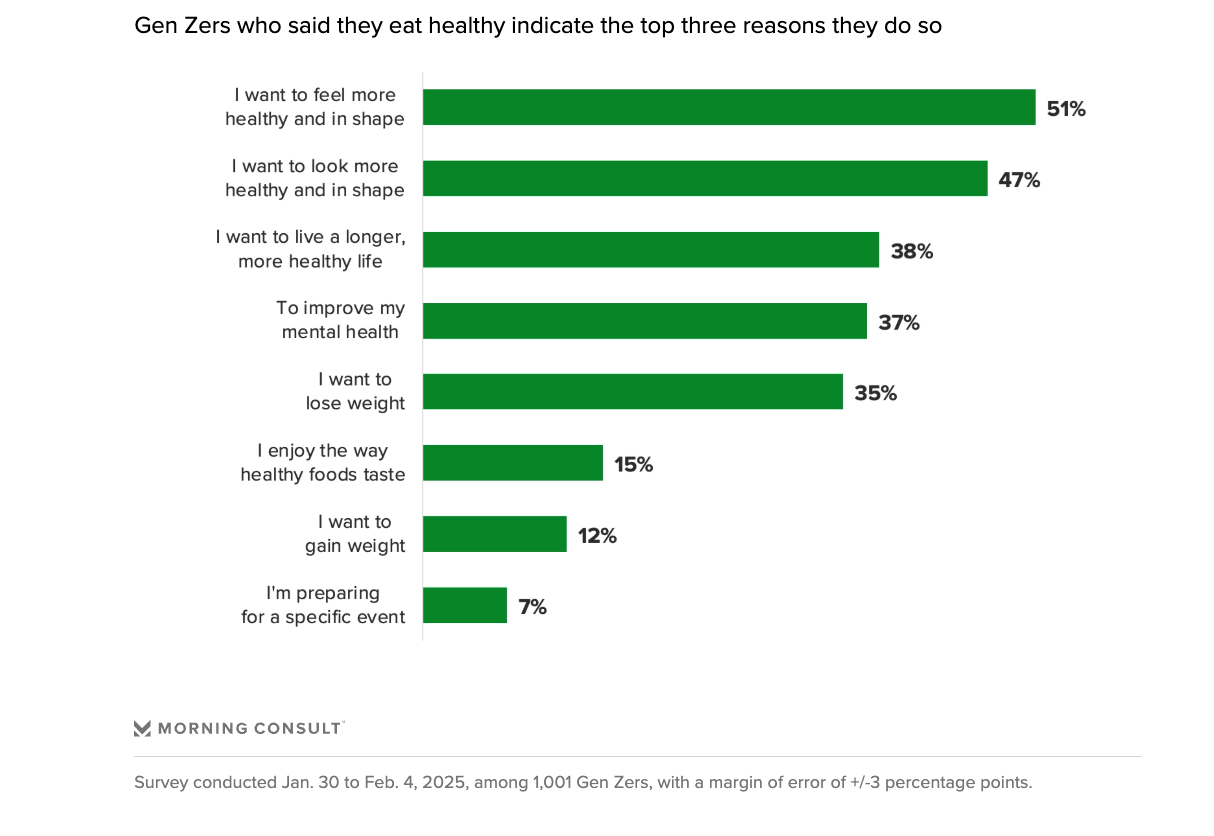 Reasons for eating healthy vary amongst Gen Zers, but the most common is that they want to feel healthy and in shape, slightly outperforming the desire to look healthy and in shape. Even a small difference here represents a sea change from the mindset of millennials, who were largely raised on 90s diet culture and heroin-chic imagery, where eating less (and ultimately weighing less) were key tenets.
