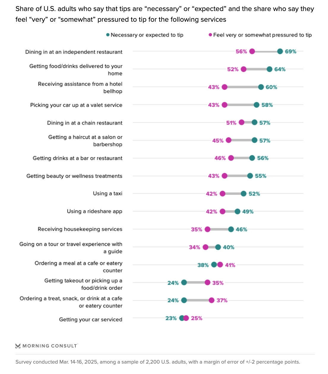 Still, a majority of adults do believe tips should be given in many situations: Among the nine services most likely to command gratuities, at least half of U.S. adults said tipping was necessary or expected. That said, the scenarios where consumers feel outsized pressure to tip lean more toward food and beverage than other categories. Dining at an independent restaurant is the occasion that most adults believe warrants a tip and is also where they feel the most pressure to do so — followed by getting delivery at home. See a data deep dive into consumers changing tipping behaviors here.