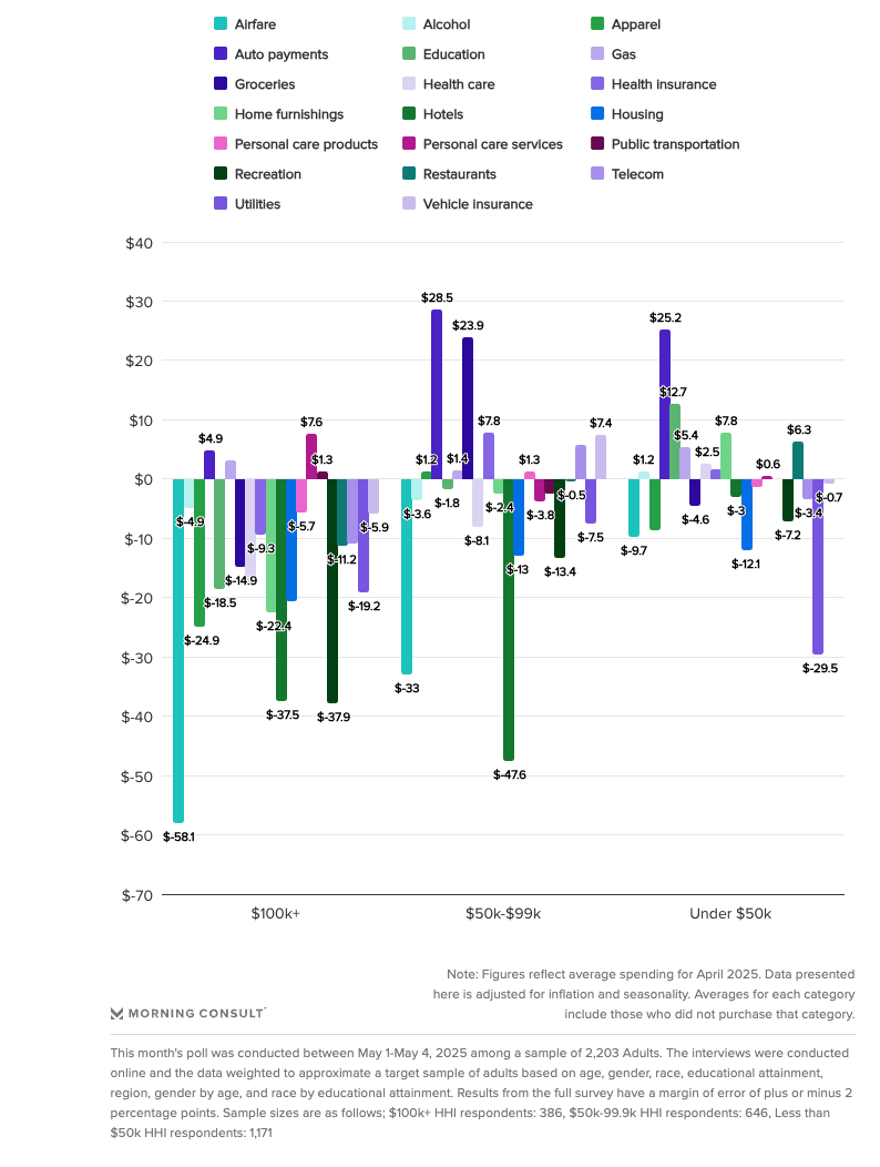 Only a handful of essential categories (gas, auto payments, personal care services, and public transportation) avoided the chopping block. Heightened volatility and increasing chatter about a possible recession in April could have prompted higher-earning consumers to put on the brakes. Explore more category spending changes here.