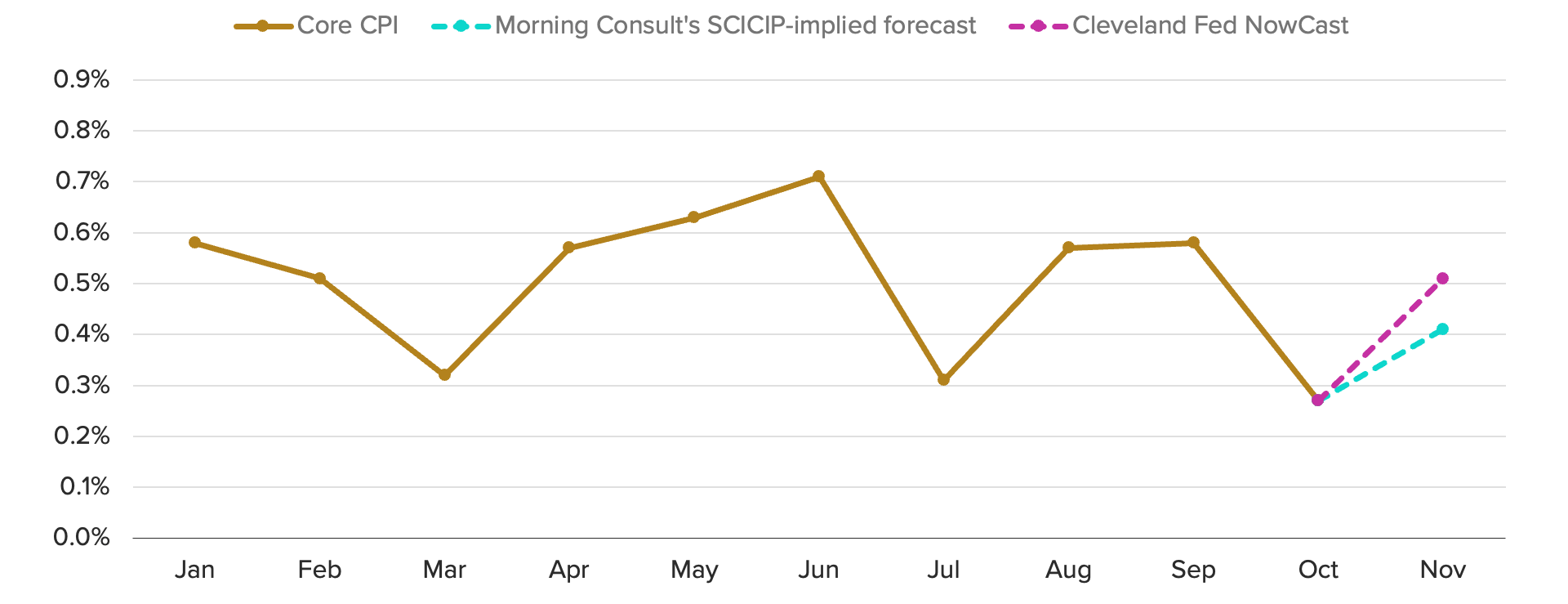 To quantify this risk, we construct a SCICIP-implied forecast for November core CPI inflation from a Bayesian regression with data-driven hierarchical shrinkage priors. This forecast exclusively relies on the five SCICIP, therefore translating the indexes in October to a core CPI inflation scale. Shown below in comparison to the Cleveland Fed nowcast, Morning Consult’s SCICIP-implied forecast for November calls for a 0.41% increase in core CPI inflation — higher than in October, but still the fourth smallest increase this year.