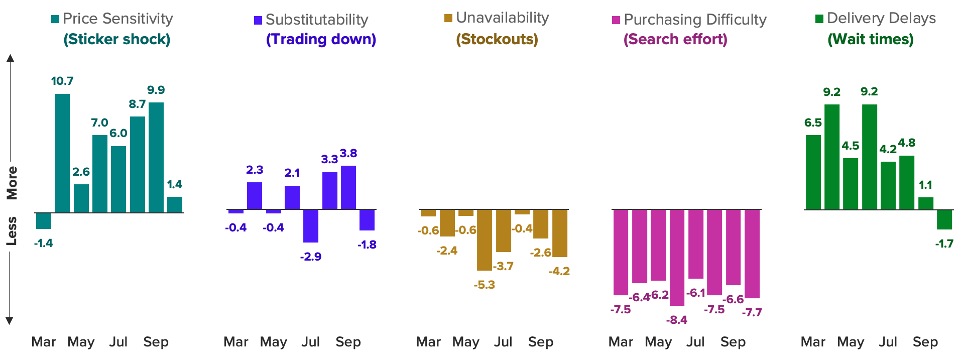 Rising core inflation in August and September coincided with an increase in inflation avoidance behaviors by consumers, as seen in Morning Consult’s Price Sensitivity and Substitutability indexes, which measure sticker shock and trading behavior, respectively, and form the SCICIP’s demand-focused component. October, however, appeared to mark a reversal of this trend: Core inflation posted its smallest gain of 2022, and both sticker shock and trading-down behaviors subsided substantially. All five of the SCICIP declined last month, with the more supply-focused Unavailability, Purchasing Difficulty and Delivery Delays indexes also signaling easing supply conditions for stockouts, search effort and wait times for online orders.