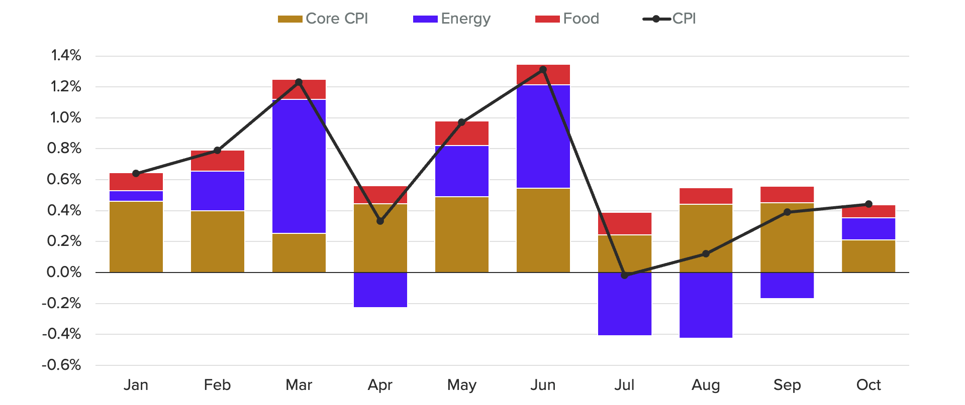 October was not the first time that core inflation has slowed this year. Similar decelerations occurred in March and July as well, but each time they were followed by a rebound in the rate of inflation the subsequent month. In each instance, there were particular categories where prices made outsize contributions to the slowdown in core inflation. For example, in October, medical care prices declined 0.6%, accounting for close to 20% of the deceleration in core CPI inflation from September to October. Perhaps not surprisingly, some forecasters anticipate this scenario playing out again for November core CPI inflation.
