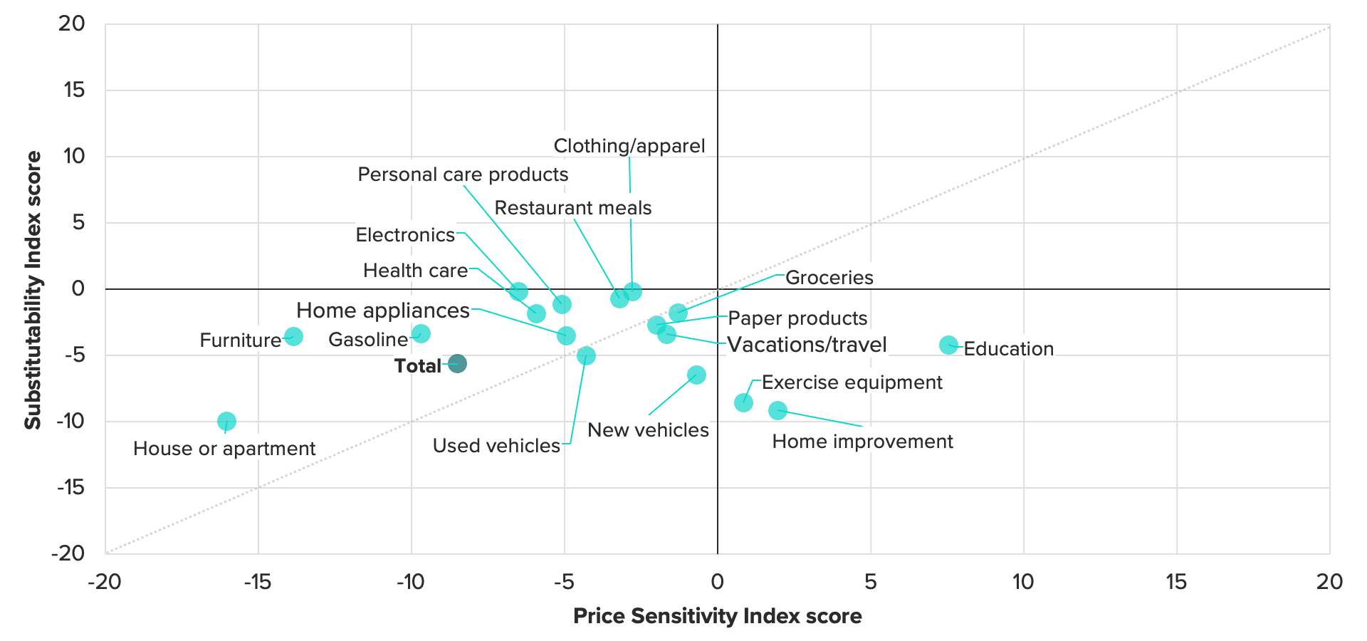 Additionally, signs of inflation relief in the category-level SCICIP were more broad-based in October than they were in July. On the demand side, the net changes in the Price Sensitivity and Substitutability indexes affected nearly every category last month in a positive way (i.e. less sticker shock and trading down), whereas from June to July they were largely driven by just a few categories. A comparison of the net changes in these indexes in each of these months is shown below: In October, all 17 underlying components registered improvement in either trading down, sticker shock or both, compared with only 10 in July. A wide-reaching shift like October’s seems less likely to reverse itself quickly than a narrowly driven one such as took place in July.