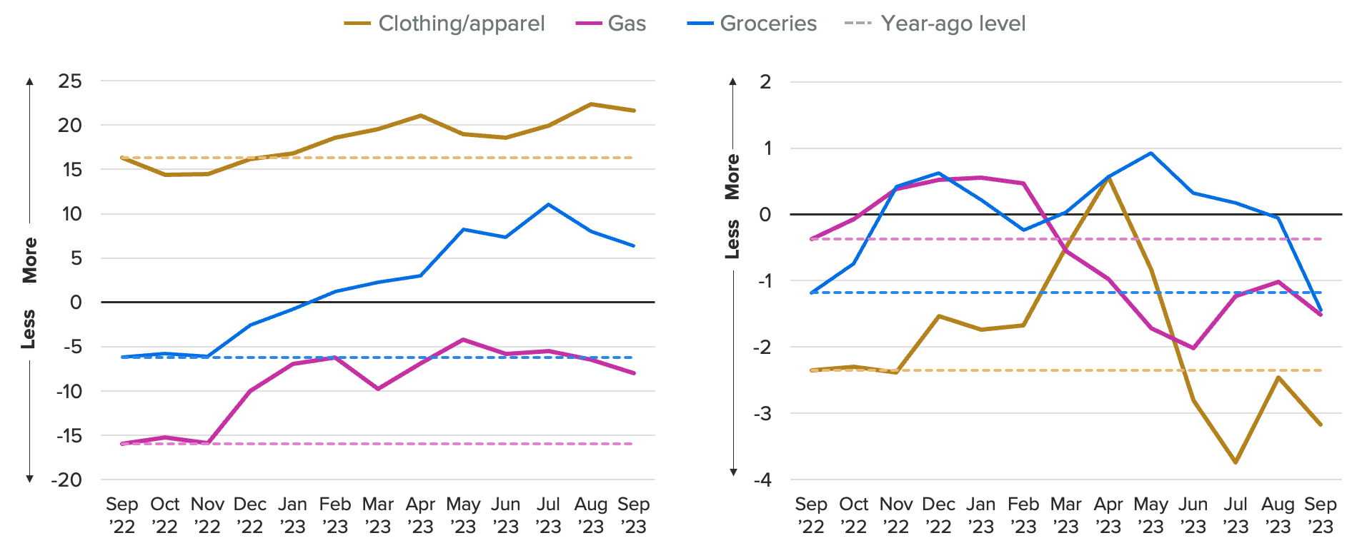 Looking at everyday purchases, shopping behaviors for frequently purchased items like gas, groceries and clothing have followed different trajectories over the past year, though all categories had higher levels of price sensitivity and lower levels of trading down in September compared with the same month a year ago. Clothing is the category consumers remain consistently more willing to walk away from but less likely to trade down on — likely because these purchases are more discretionary than groceries and gas, but also more differentiated and, consequently, harder to substitute.