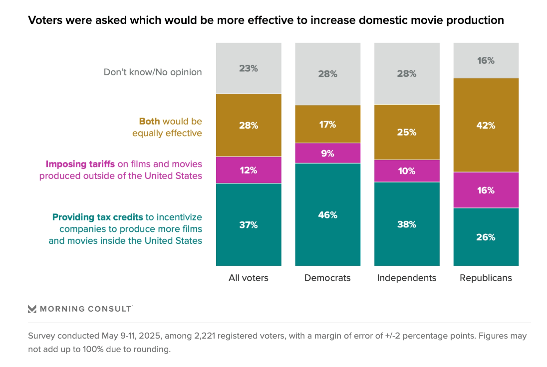 Our survey found that 37% of voters think Newsom’s idea, to create a $7.5 billion federal tax credit to incentivize companies to produce more films and movies inside the country, would be more effective, compared with 12% who said the same of Trump’s approach, a 100% tariff on all films produced outside of the United States. Along with roughly a quarter who are unsure, another 28% — including 42% of Republicans — said both would work equally well. Read more to see who voters think boosting the film industry would help the most.