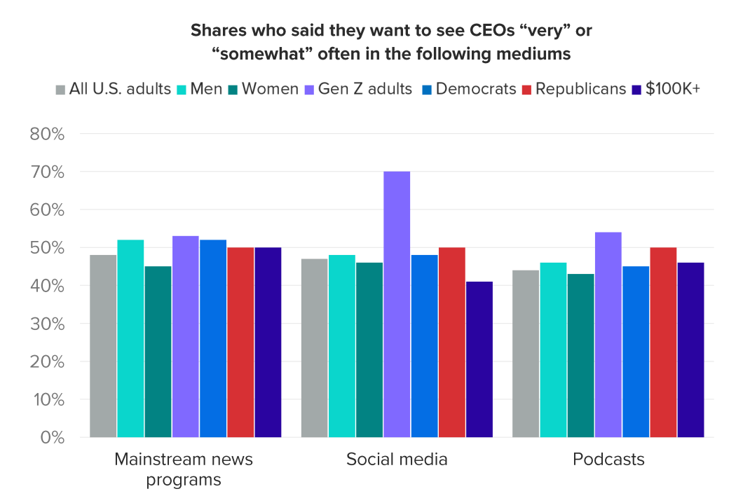 As for where U.S. adults want to hear from business leaders, there is no strongly preferred channel: Roughly half said they would like to see CEOs “very” or “somewhat” often on all three news mediums we tested. That said, the story is different among Gen Z adults – the young cohort displayed the strongest overall desire to hear from the executive class with greater frequency, especially via social media and podcasts. Download our full report to see what Americans really think of CEOs, including a ranking of consumers’ favorite executives.