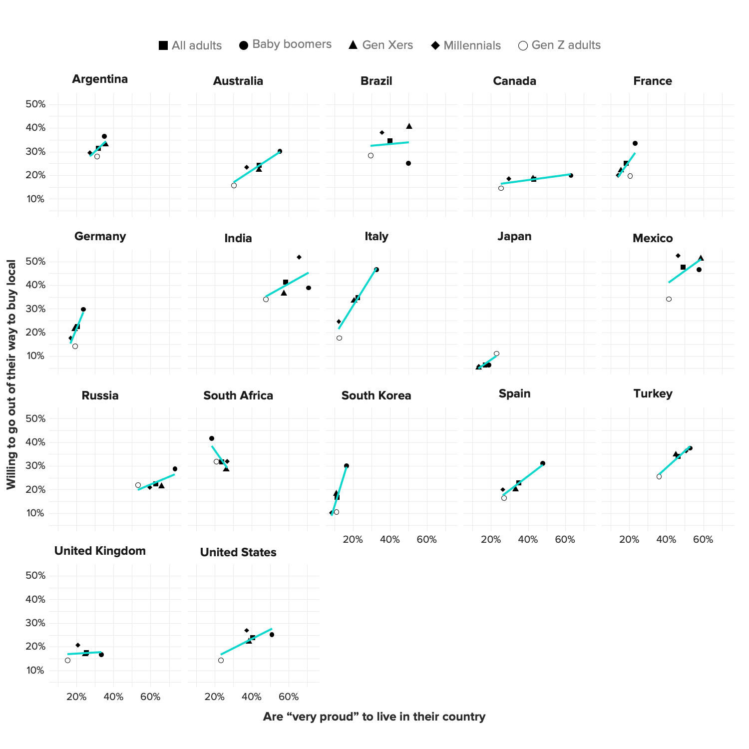In the United States, consumer demand for “Made in America” goods is higher among more patriotic generations. A similar relationship holds for most global markets: On average, less patriotic generations are less inclined to go out of their way to buy domestic goods and services. South Africa is again an outlier.