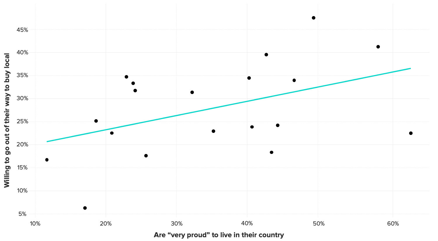Particularly relevant for consumer-facing companies, our data finds a clear positive relationship between national pride and consumers’ interest in buying domestic goods and services, both in America and in most other countries.