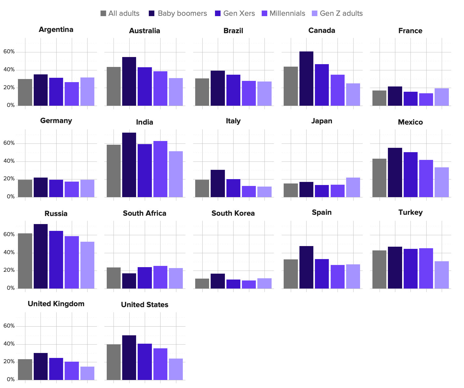 Cross-country variation in patriotic sentiment is also substantial. Russians of all generations are among the most proud globally, likely due to a “rally around the flag” effect in the wake of Moscow’s invasion of Ukraine. Meanwhile, countries in continental Europe and East Asia see lower patriotism overall, with millennials expressing somewhat less national pride than Gen Z adults. We view post-World War II wariness of unbridled nationalism as one likely explanation. Elsewhere, we observe idiosyncratic patterns, such as Indian Gen Xers expressing less pride compared with other generations, perhaps due to backlash against perceived anti-pluralism.