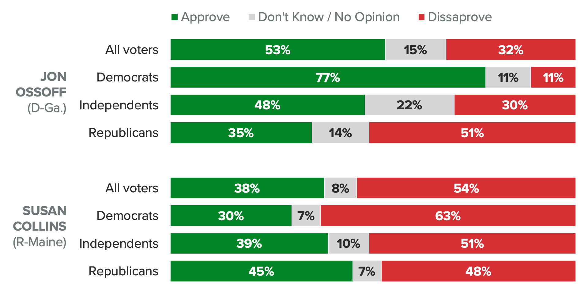 Ossoff is in a far better position at this point in the cycle than the other vulnerable incumbent who could face voters next year, Republican Susan Collins of Maine. Voters in the senior appropriator’s home state are 15 points more likely to disapprove than approve of her job performance (54% to 38%). That’s down from a 9-point deficit in the first quarter and the lowest on record since our quarterly tracking began in 2017.