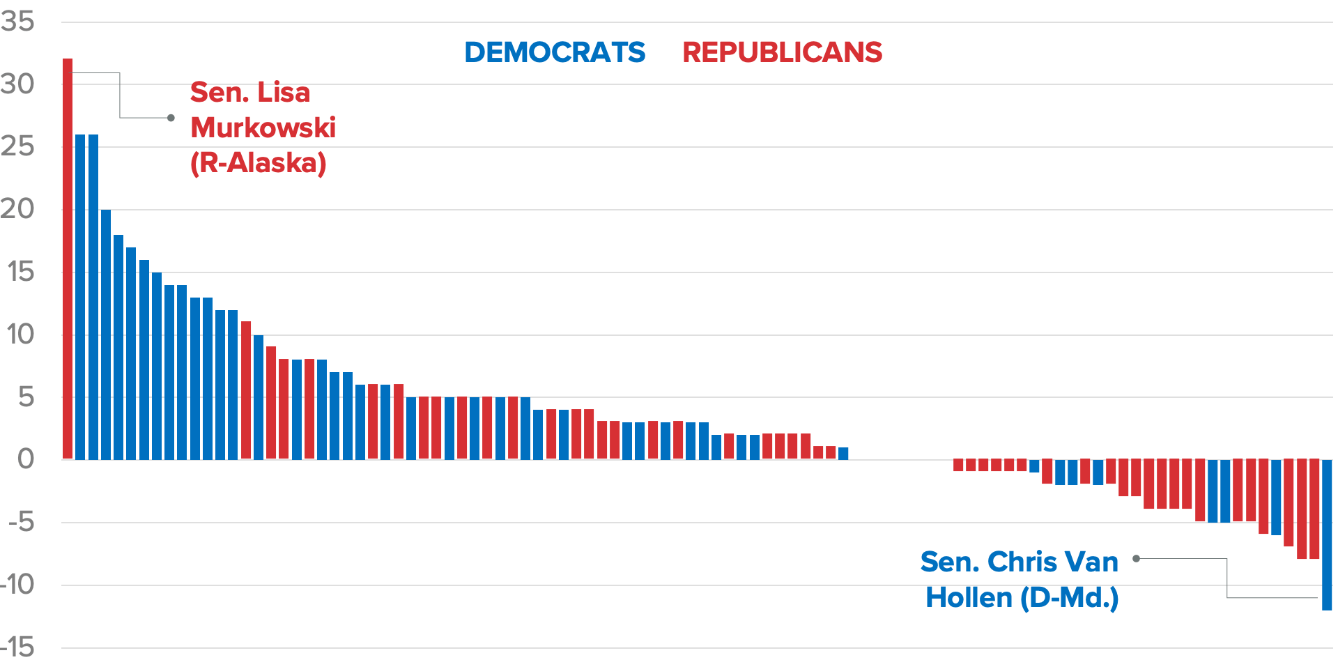 More Democrats than Republicans in the Senate are seeing upticks in net approval among GOP voters