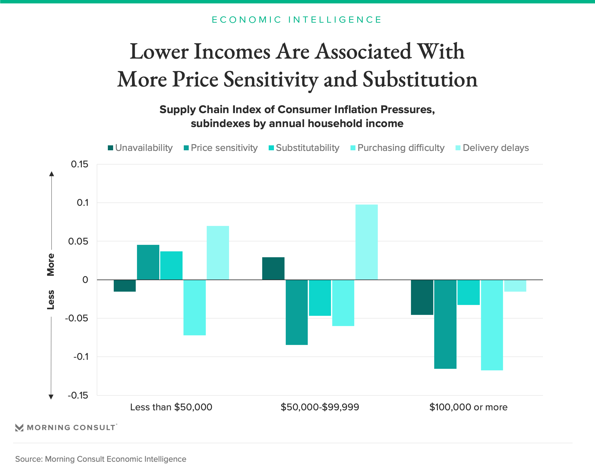 Disrupted supply chains and inflation are affecting the purchasing behavior of lower-income adults more so than their higher-earning peers: Adults from lower-earning households are more likely to report higher price sensitivity and a greater willingness to substitute with lower-priced alternatives.