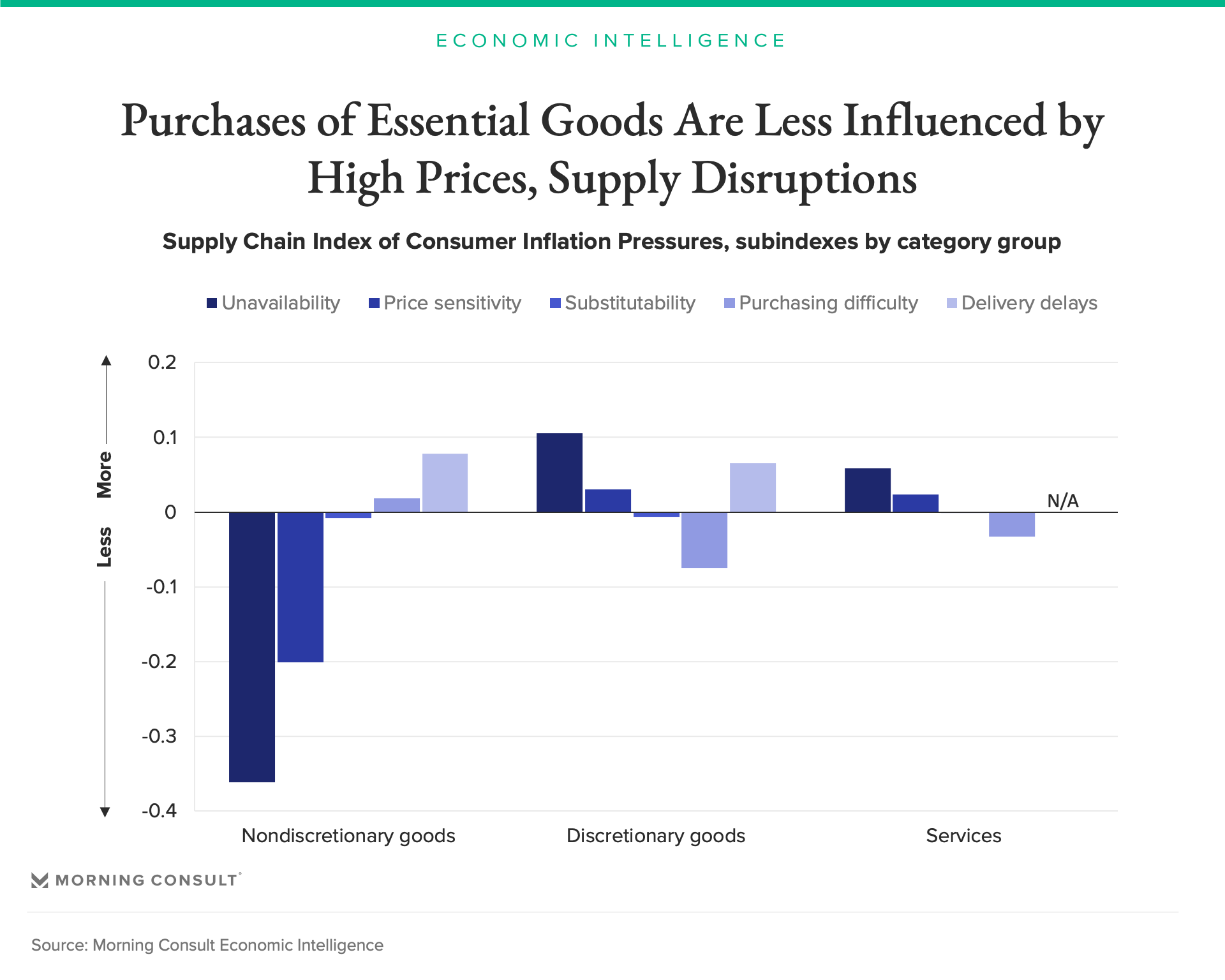 Consumers’ purchasing behavior for the services tracked in Morning Consult’s Supply Chains and Inflation Survey — which includes both discretionary and nondiscretionary services — resembled their buying patterns for discretionary goods. Although services like shelter and health care are critical to overall well-being and might be expected to more closely mimic essential goods in their index scores, often these purchases can also be delayed for a time. For instance, there is usually a more flexible time horizon for procuring homes or appointments than for buying gas and groceries. The relatively low cost of deferring services — even essential ones — results in purchasing behavior that is more in line with discretionary goods.