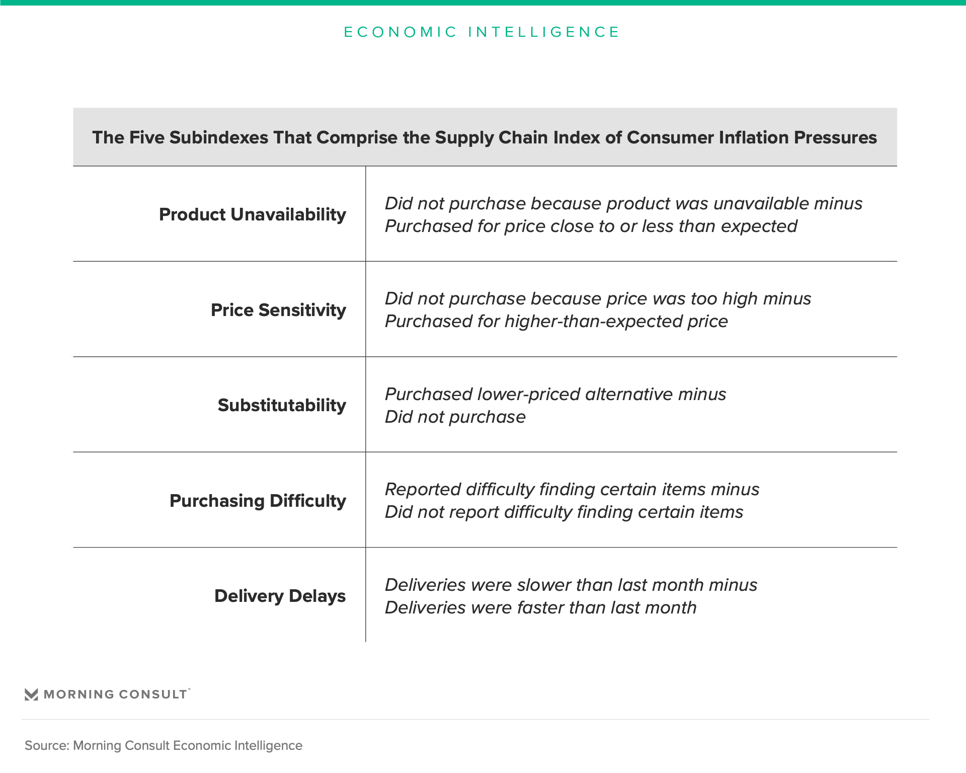 Morning Consult’s new subindexes track supply chain disruptions and inflationary pressures from the consumer perspective, providing insight into how U.S. adults are responding to rising prices and shortages across different types of goods and services. The table below describes the five subindexes: