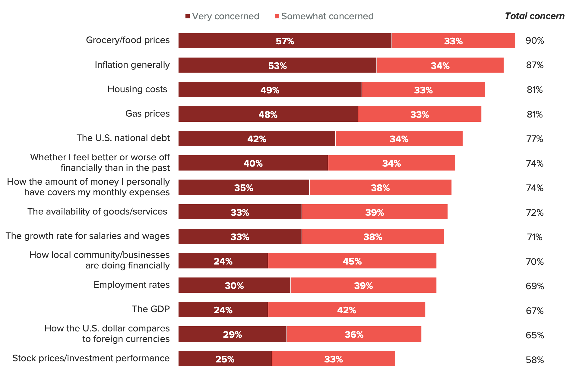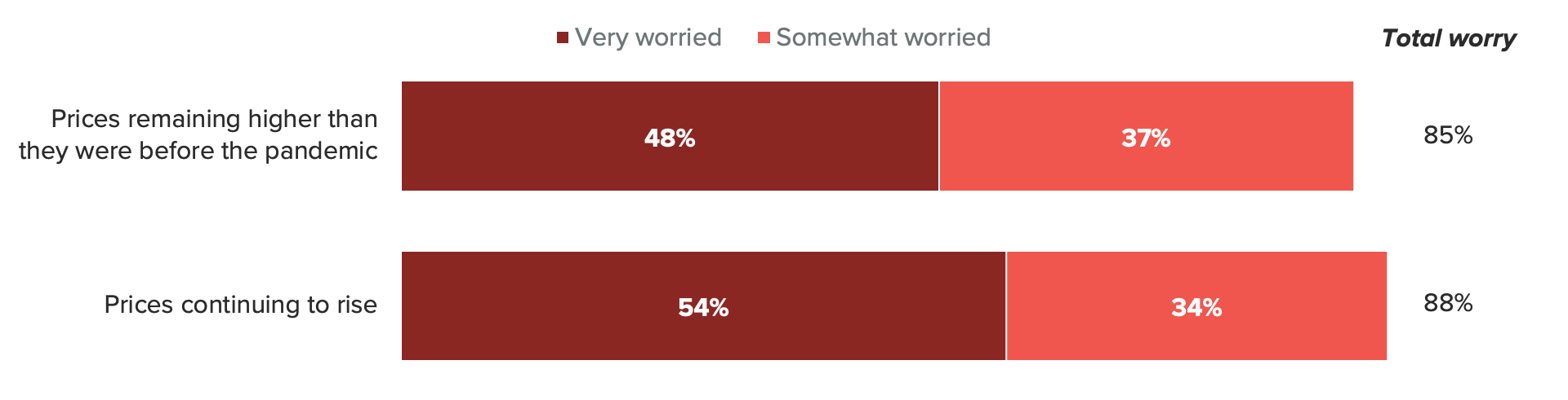 However, consumers are roughly as concerned about price levels as they are about price growth. When asked about their concern for each, consumers were slightly more likely to be worried about prices growing (88%) than they were to worry about the prices remaining above where they were in 2019 (85%).