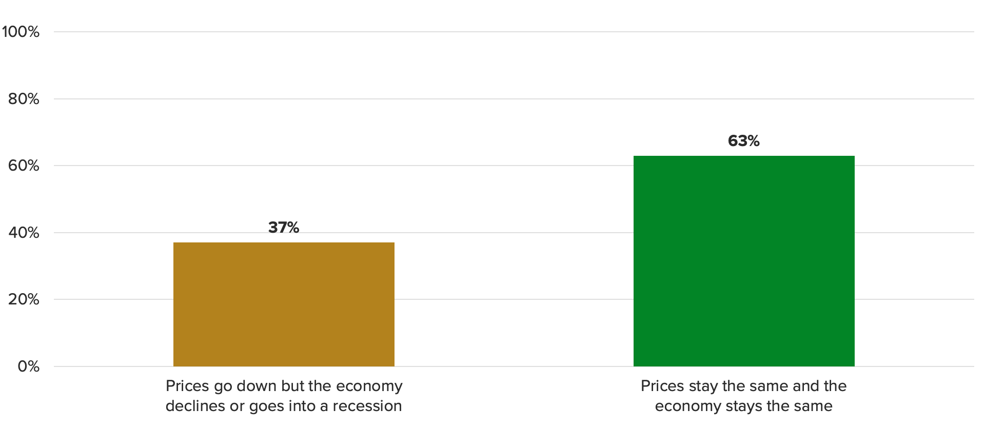 At the same time, 37% of respondents still would prefer prices to go down even if it resulted in a recession, implying that a good share of consumers want prices to deflate no matter the economic consequences — or perhaps they think that they would be less personally affected. Another explanation could be that consumers are expecting a recession anyway: A potential recession has been at the forefront of economic news in recent years, especially with many economists predicting one since the Federal Reserve began its aggressive rate increases.