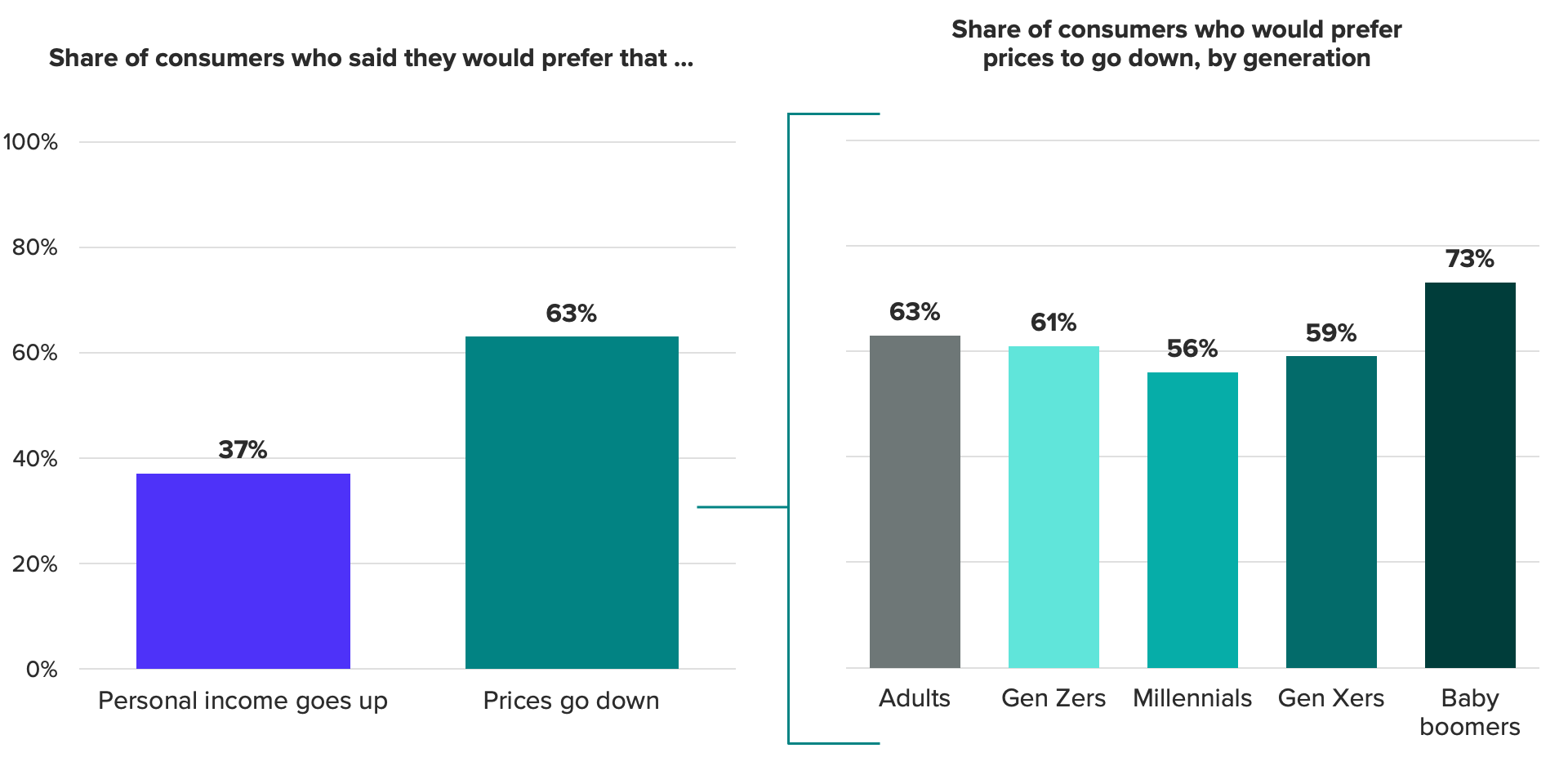 Some of this could be explained by labor dynamics: Gen Zers (61%) and baby boomers (73%) are more likely than other generations to want prices to go down. The youngest and oldest generations are more likely to be out of the labor force, which would make them more sensitive to higher prices and less likely to be working for wages. However, even a slight majority of millennials and Gen Xers, who make up the majority of the workforce, would prefer prices to go down rather than their incomes to go up.