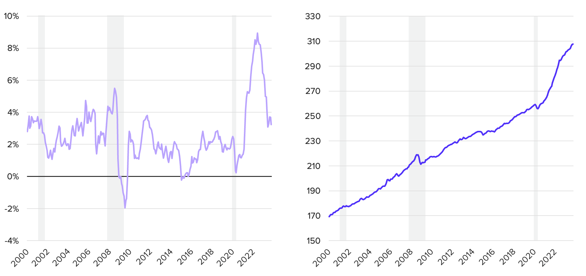 Year-over-year change in inflation (left) and price level index 1982-1984=100 (right)