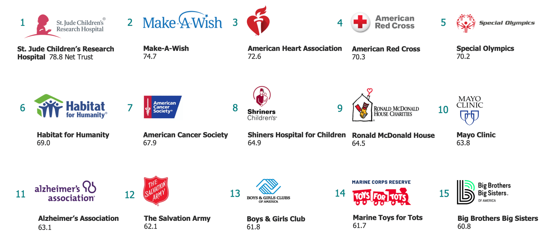 Survey respondents were asked how much they trust 50 major nonprofits to do the right thing. The rankings are determined by net trust (the share who say they trust each brand minus the share who don’t trust the brand).