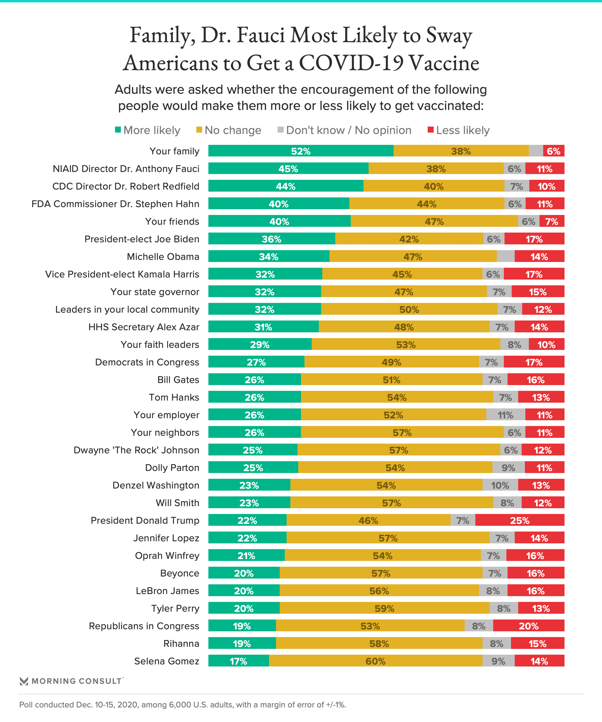52% of adults said their family members could sway them to get a COVID-19 vaccine, while Dr. Anthony Fauci was the most influential public figure, at 45%.