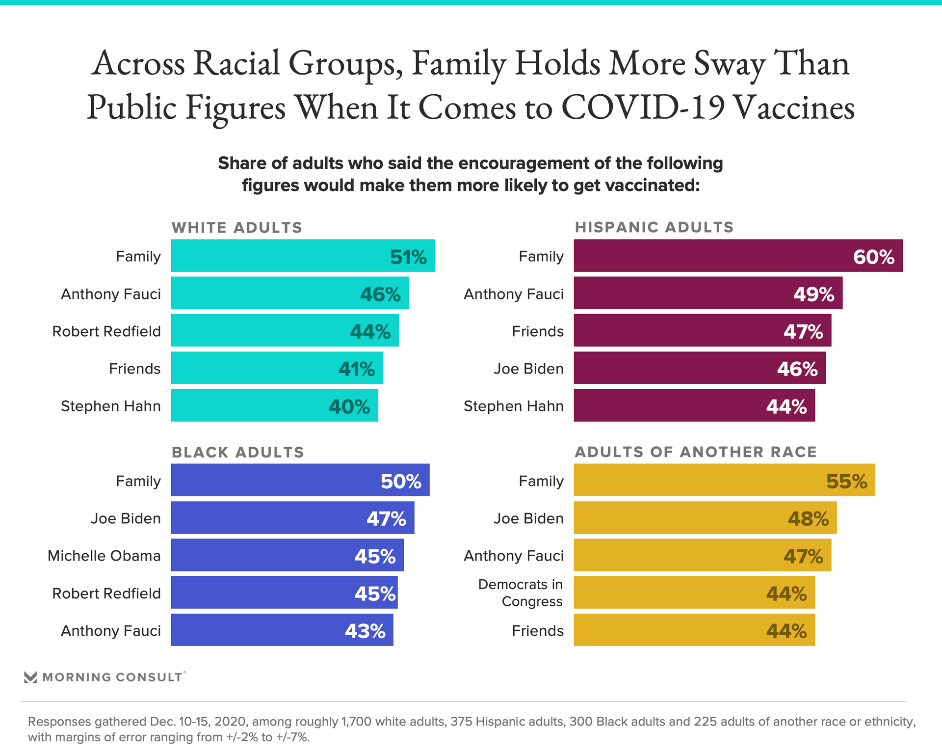 Other than family, Black adults are most likely to be convinced to get a vaccine by President-elect Joe Biden (47%), while Hispanics listed Fauci (49%) as the top vaccine influencer.