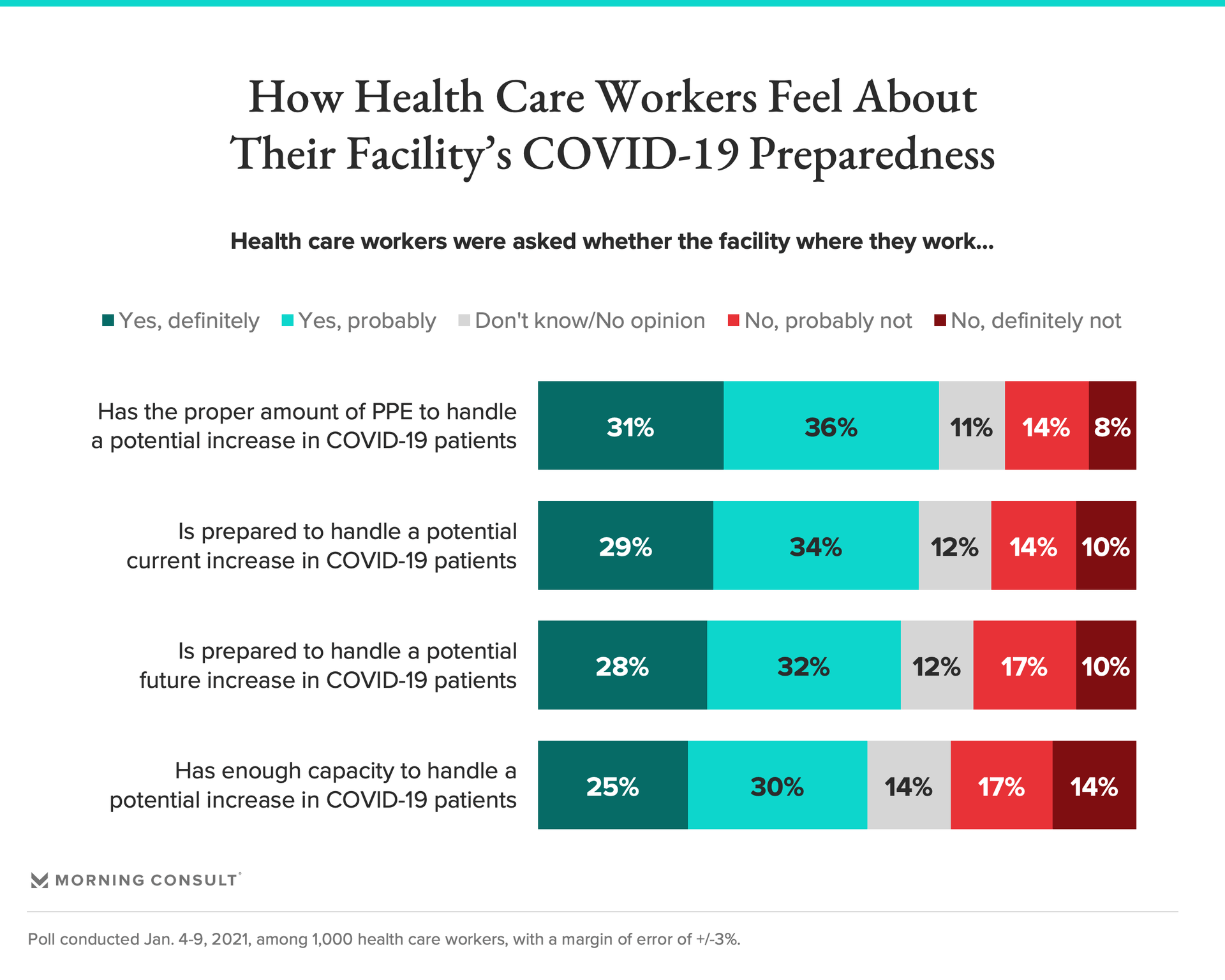 In the poll conducted Jan. 4-9 among 1,000 health care workers, over half (55 percent) said their facilities have enough capacity to handle a potential increase in COVID-19 patients, though roughly a third (31 percent) said their facilities wouldn’t have the space in such an event. The survey has a margin of error of 3 percentage points.