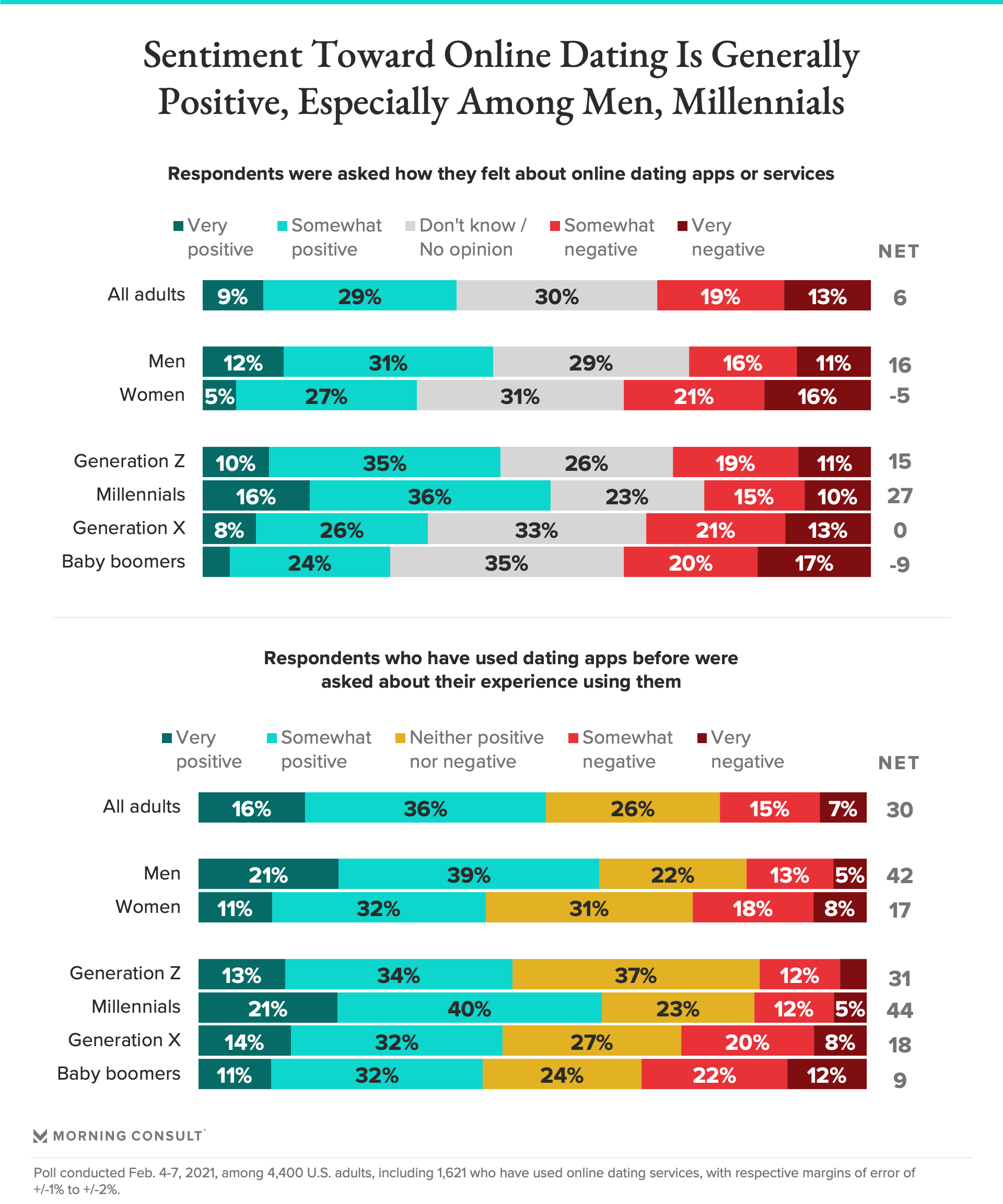 Today, people are slightly more likely to express positive views about online dating services than they are negative ones, according to a Morning Consult survey conducted Feb. 4-7, 2021 among 4,400 U.S. adults. Thirty-eight percent of respondents said they feel positively about online dating, while about one-third (32 percent) said they feel the opposite, creating a net positive sentiment.