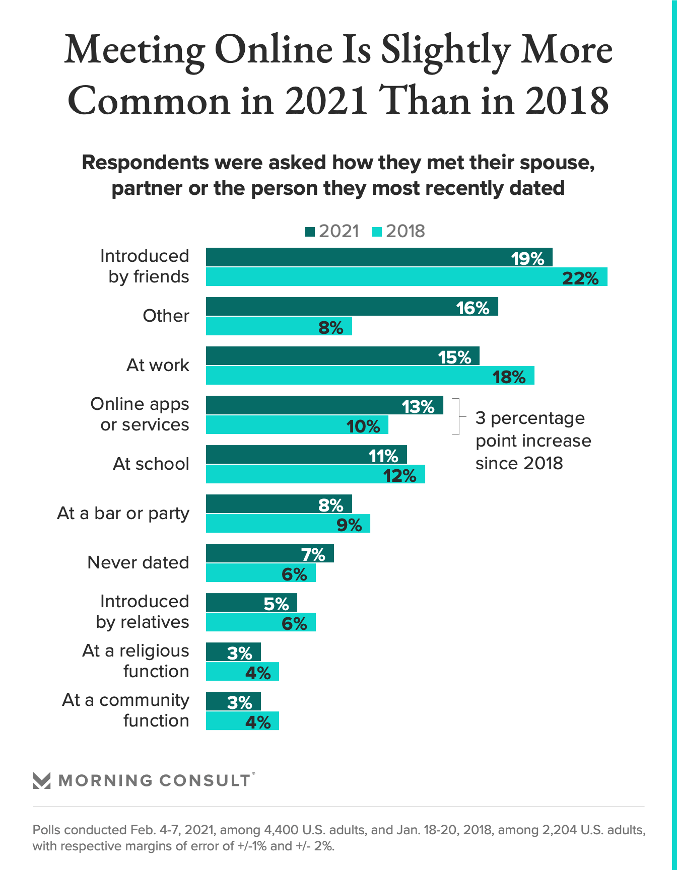 Thirteen percent of all adults said they have met a partner online as of this year, compared with 10 percent three years ago, according to a Morning Consult survey conducted Jan. 18-20, 2018. That increase is within the margin of error for the group.