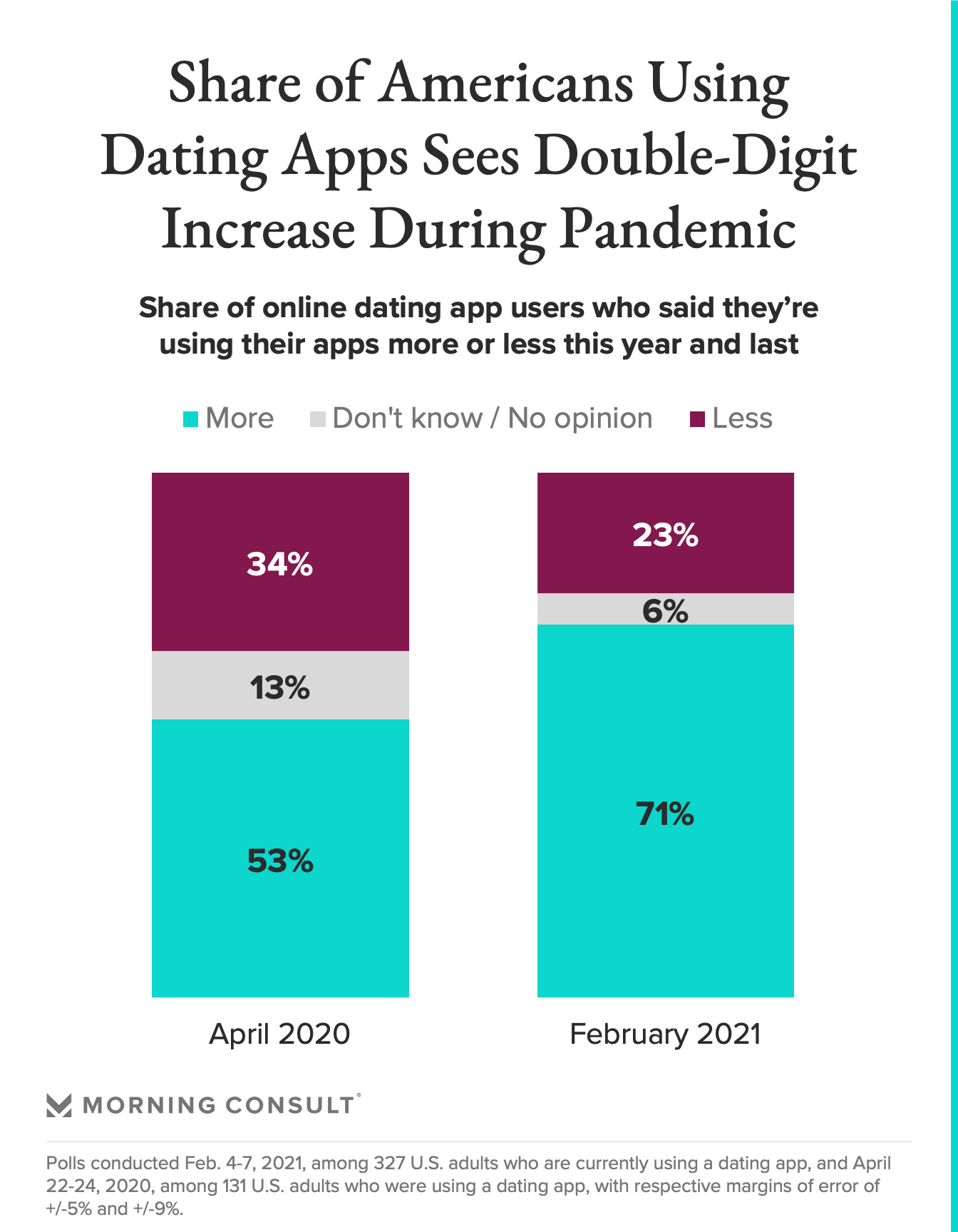 Amid the pandemic, dating app usage has shot up by double digits, according to Morning Consult trend data. Early in the lockdown era in the United States, 53 percent of adults who used dating platforms said they were doing so more often. As of the February survey, that share increased to 71 percent.