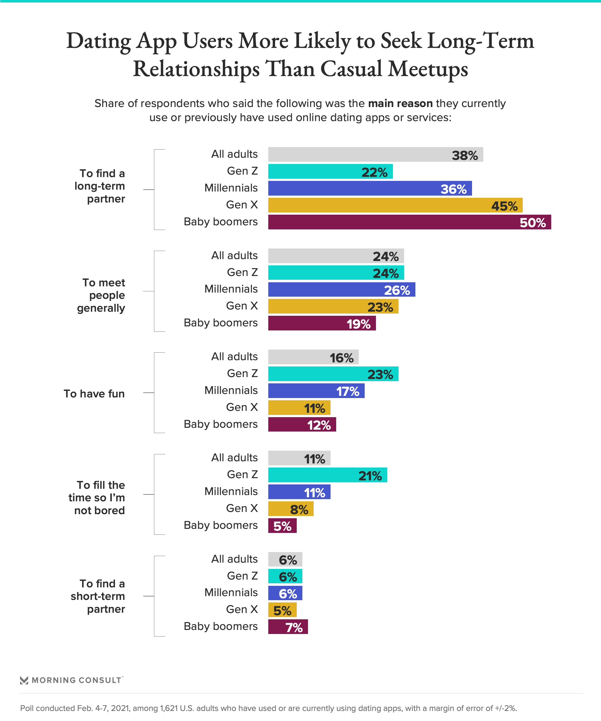 Thirty-six percent of millennials using online dating platforms said they do so primarily to find a partner for a long-term relationship, and that figure only increases among Generation X and baby boomer users. Gen Z users are fairly split in their main reasons for online dating.