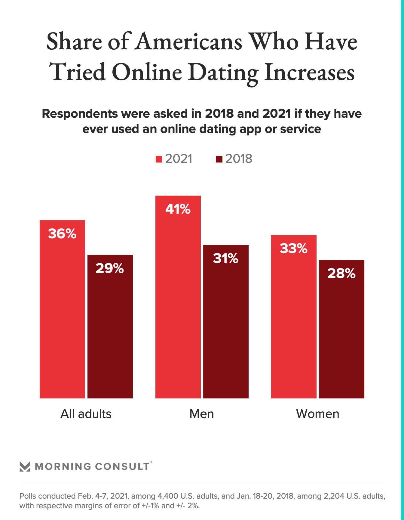 • 36% of U.S. adults have used a dating platform, up from 29% in 2018.