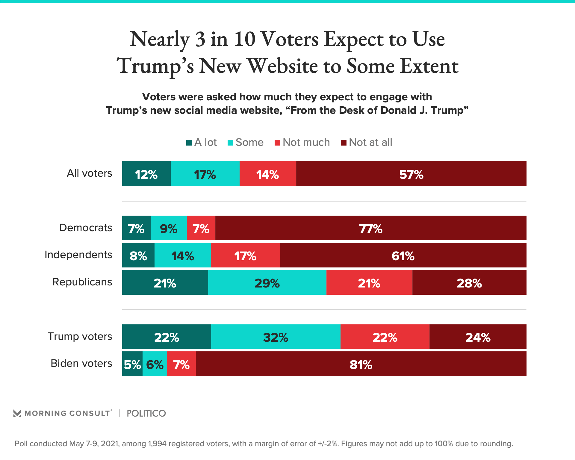 Half of Republicans said they plan to use it, with 21 percent of that share saying they would visit it a lot. Among those who voted for Trump in the 2020 election, 54 percent said they would engage with Trump’s website, including 22 percent who said they would do so a lot.