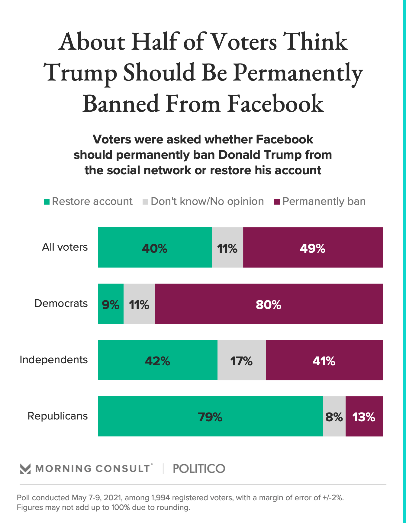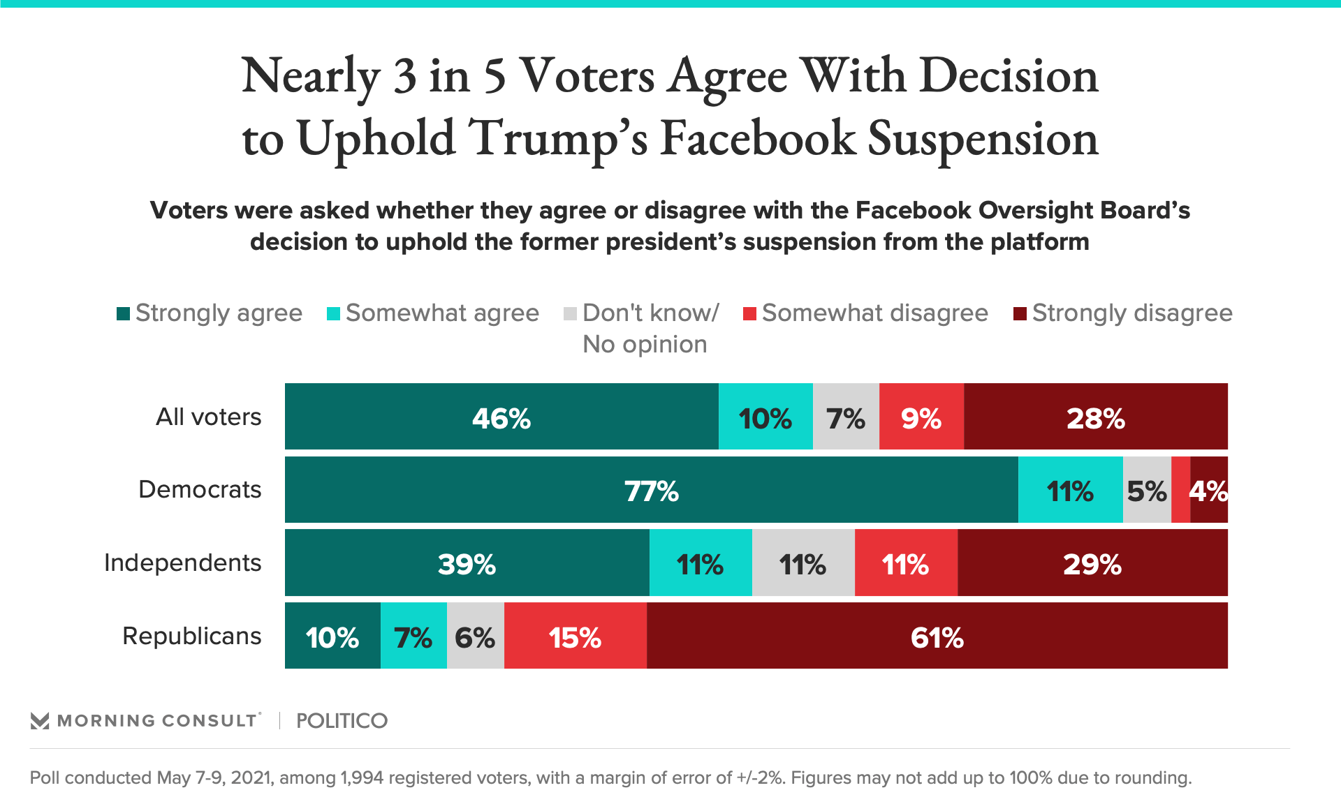 A small majority of voters agree with a ruling by Facebook Inc.’s oversight board that the social media company was justified in suspending former President Donald Trump’s account after the Jan. 6 insurrection at the U.S. Capitol, a new Morning Consult/Politico survey shows. Voters were slightly more split, however, on how Facebook should treat Trump’s account going forward.
