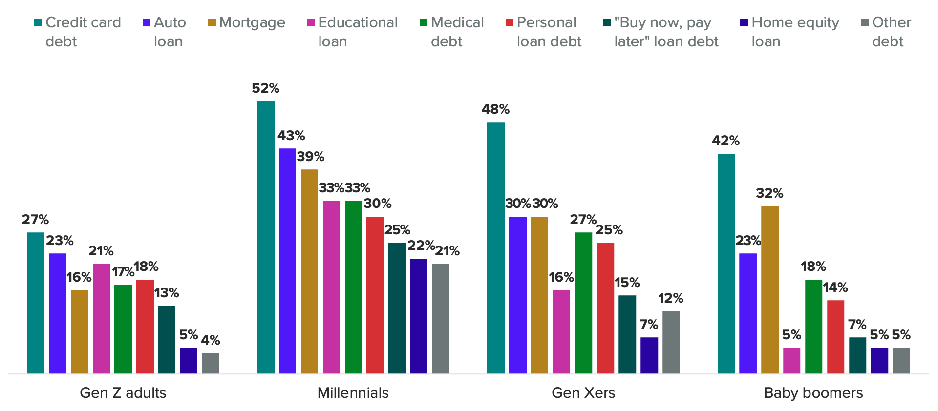 - Younger generations are also facing a heavier burden when it comes to student loans, with 33% of millennials and 21% of Gen Zers saying they have educational debt. Gen Xers weren’t far behind, however, with 16% saying they have student loans.