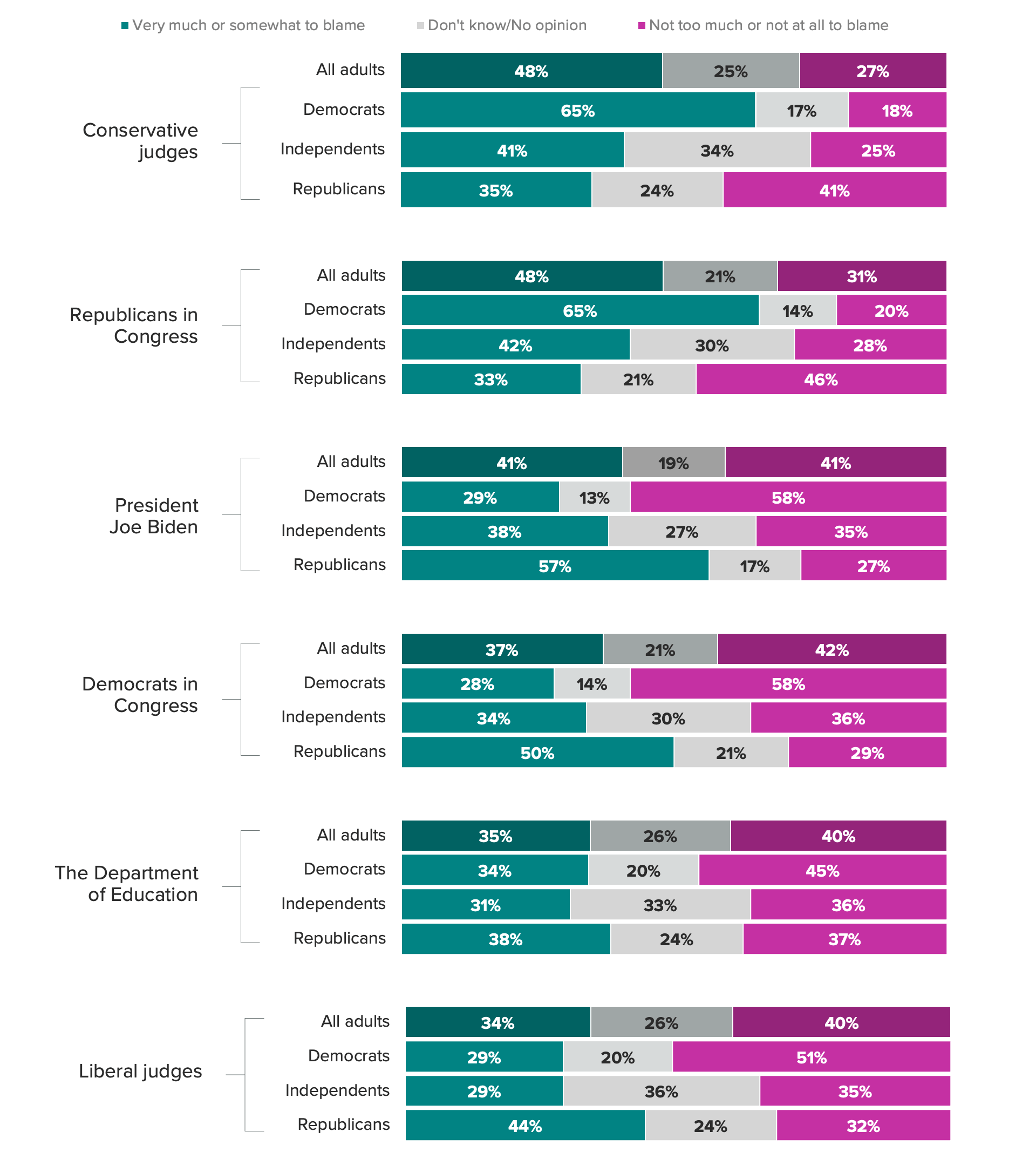 - When asked who they trust most to address how student loans are handled in the United States, 47% of adults named the Department of Education, followed by Biden and Democrats in Congress (45% each).