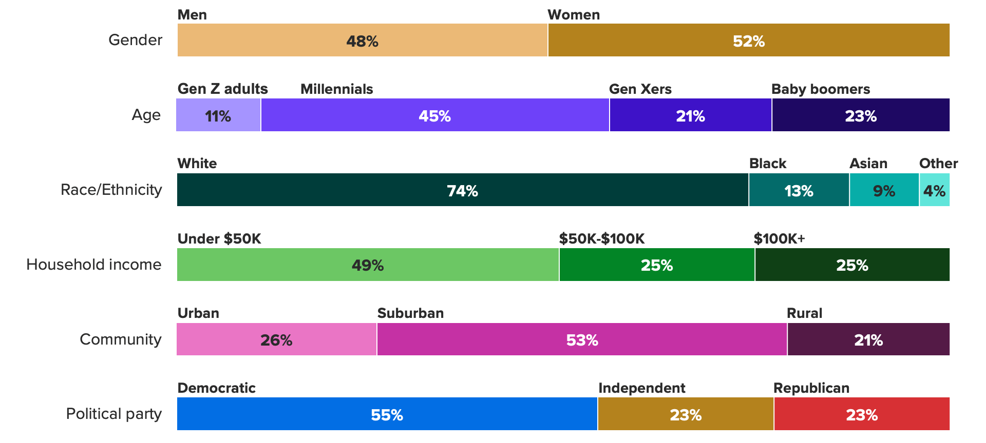 • Nearly three-fourths (74%) of self-described avid Swift fans are white. Majorities also identified as Democrats (55%) and live in suburban areas (53%).