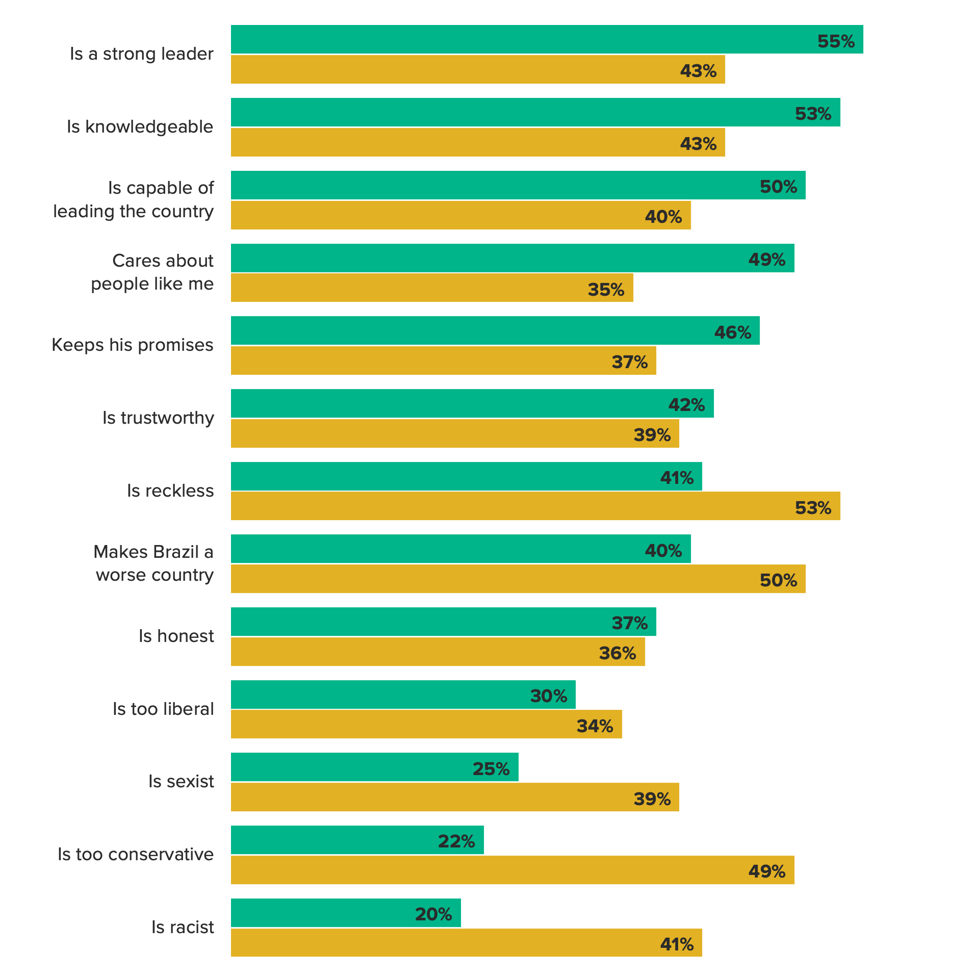 Brazilians are more confident in Lula’s leadership qualities but don’t have stars in their eyes given his previous lengthy term in office at the turn of the century, and see him as roughly as trustworthy as the unpopular incumbent.