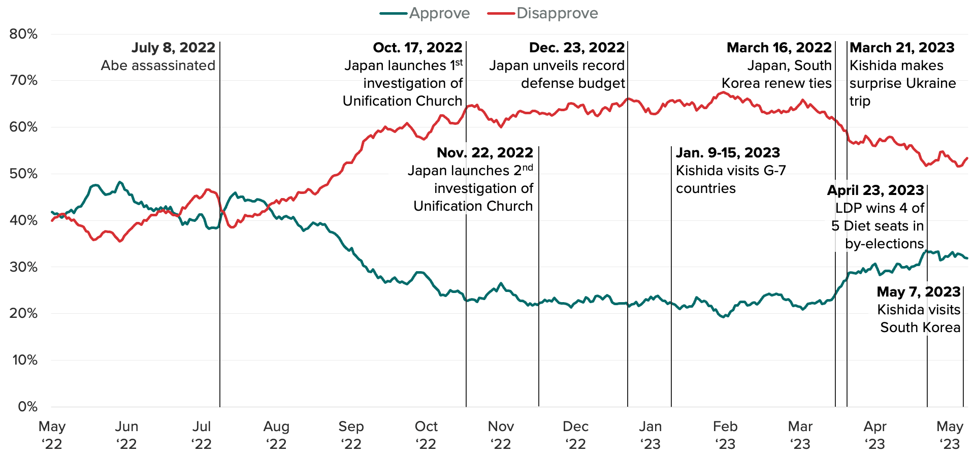 - Kishida’s approval has climbed 13 percentage points since early February, as he jetted around the globe to meet with allies and pushed a new national security strategy.
