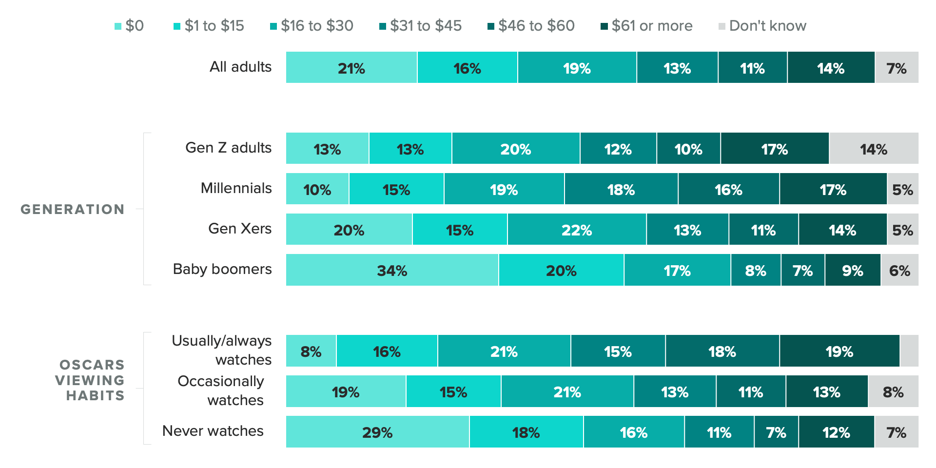 While it’s expected that Academy Award aficionados would be more avid streamers and moviegoers than those who aren’t, the fact that Oscars fans spend more on these media habits than Gen Z adults doesn’t seem like a given. Moreover, it should be promising to Hollywood that the moviegoing experience still appeals to fans of prestige films, which are increasingly seeing premium video-on-demand releases following truncated theatrical windows.